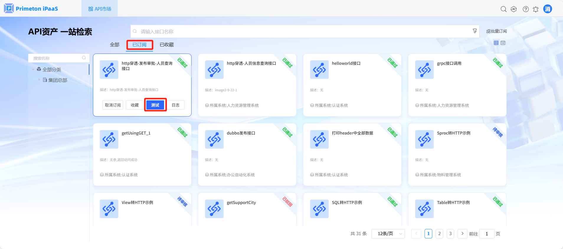 使用账号 consumer(默认密码:000000)登录系统,点击API市场,进入API市场页面。点击“已订阅”页签,消费方可以查看已订阅的接口,选择审核状态是“已通过”的订阅接口,点击接口卡片中的“测试”按钮,进入接口测试页面。