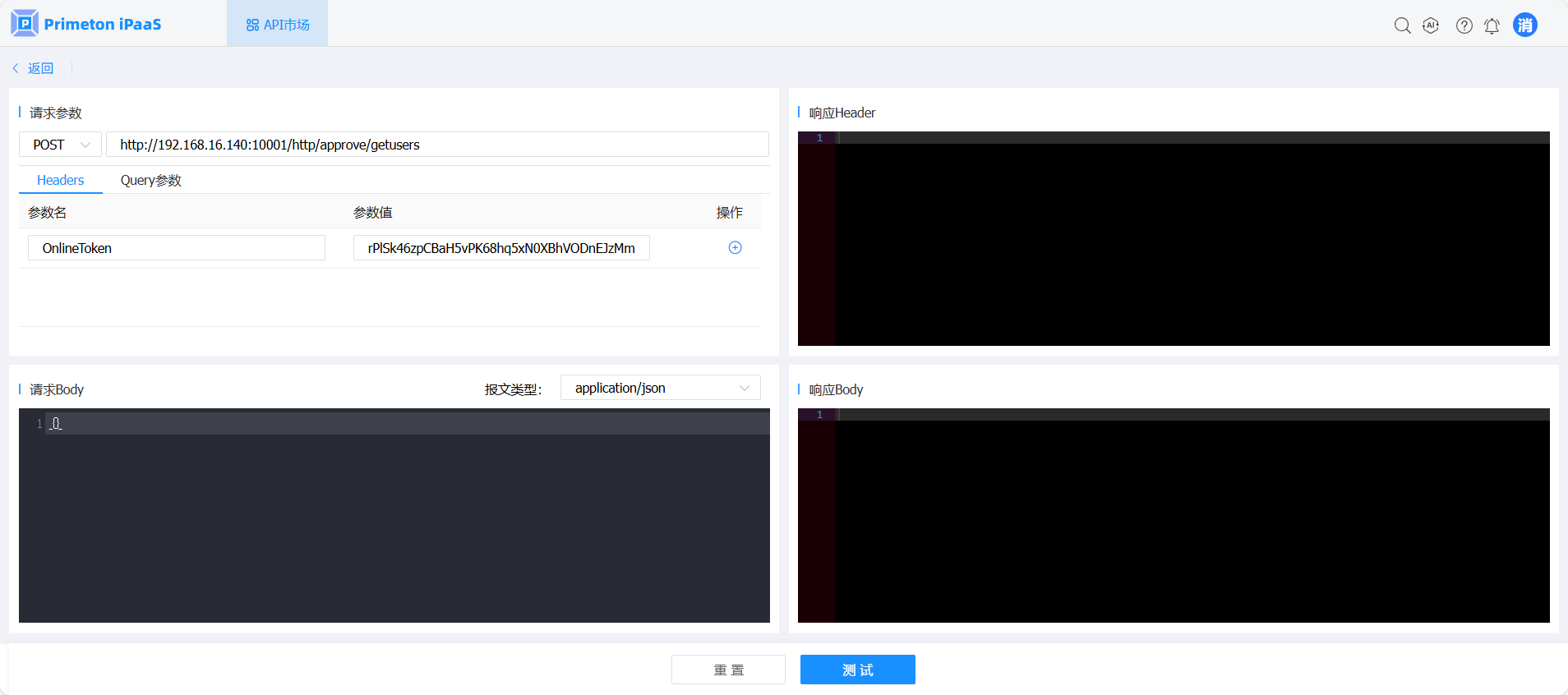 在接口测试页面,消费方可对已订阅的接口进行测试,确认接口配置及状态是否正确,消费方输入接口请求参数,点击“测试”按钮,右侧显示接口的响应头和响应体等返回信息。
