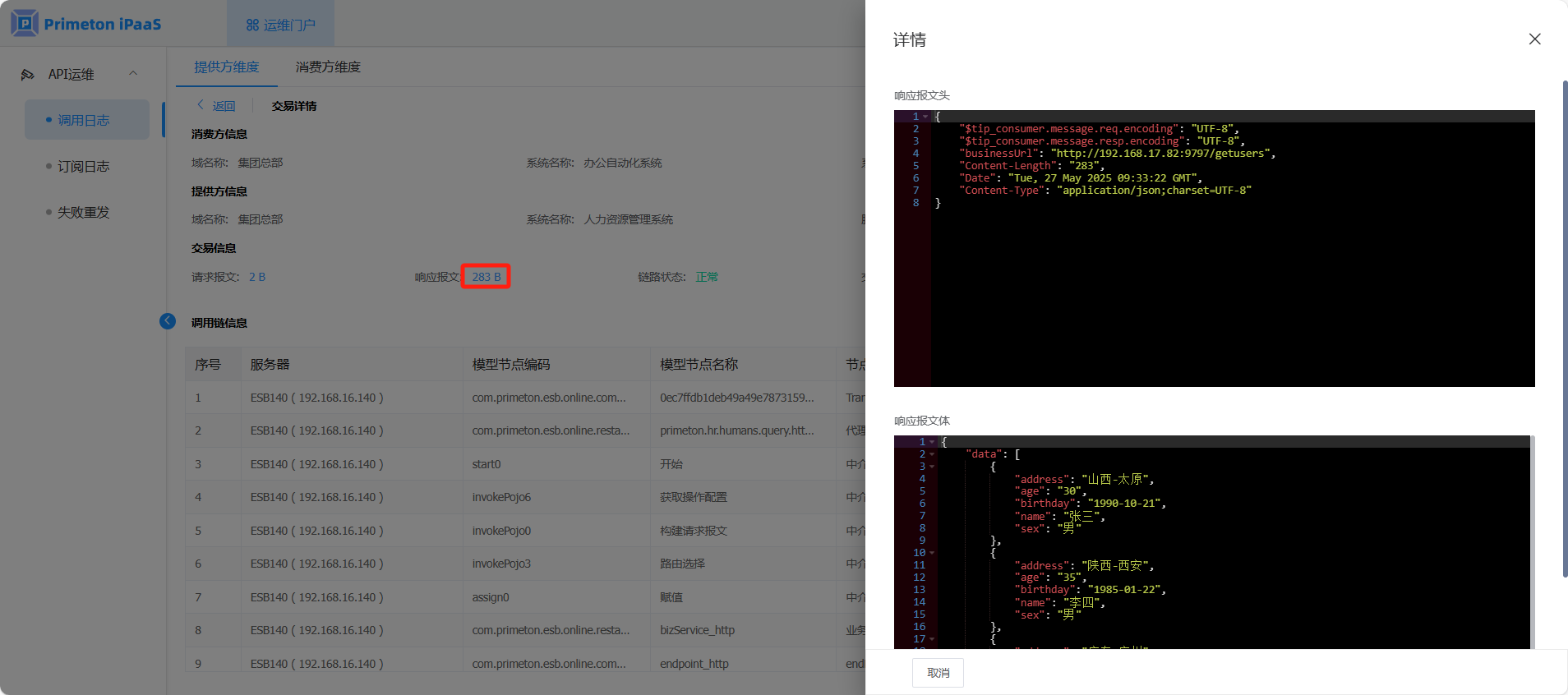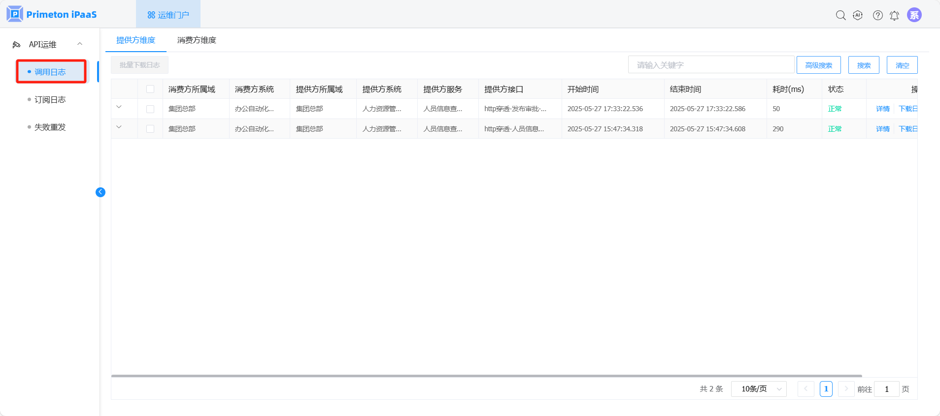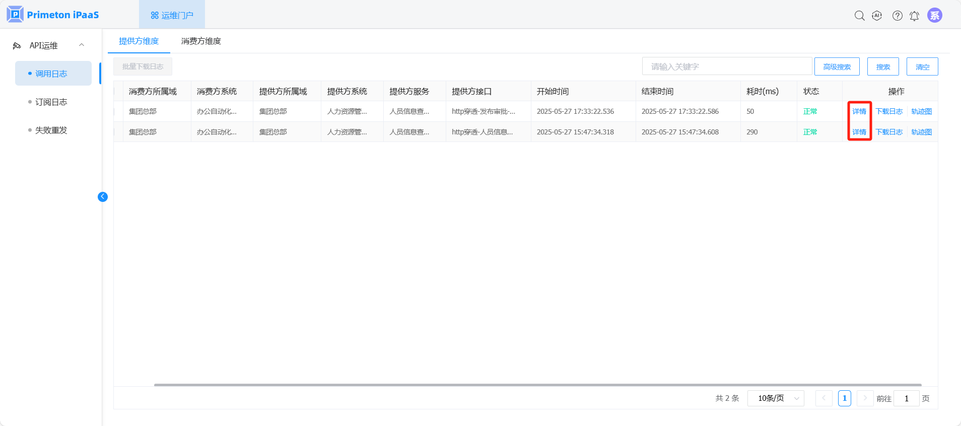 使用账号 systemmonitor(默认密码:000000)登录系统,点击运维门户,进入“API运维>调用日志”页面,系统运维人员可查看所属系统下所有接口的调用日志。