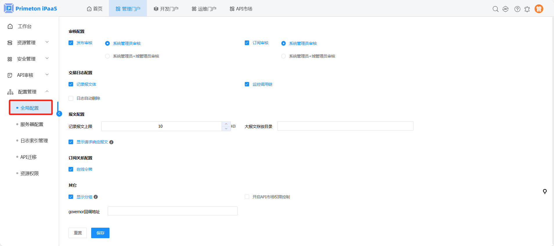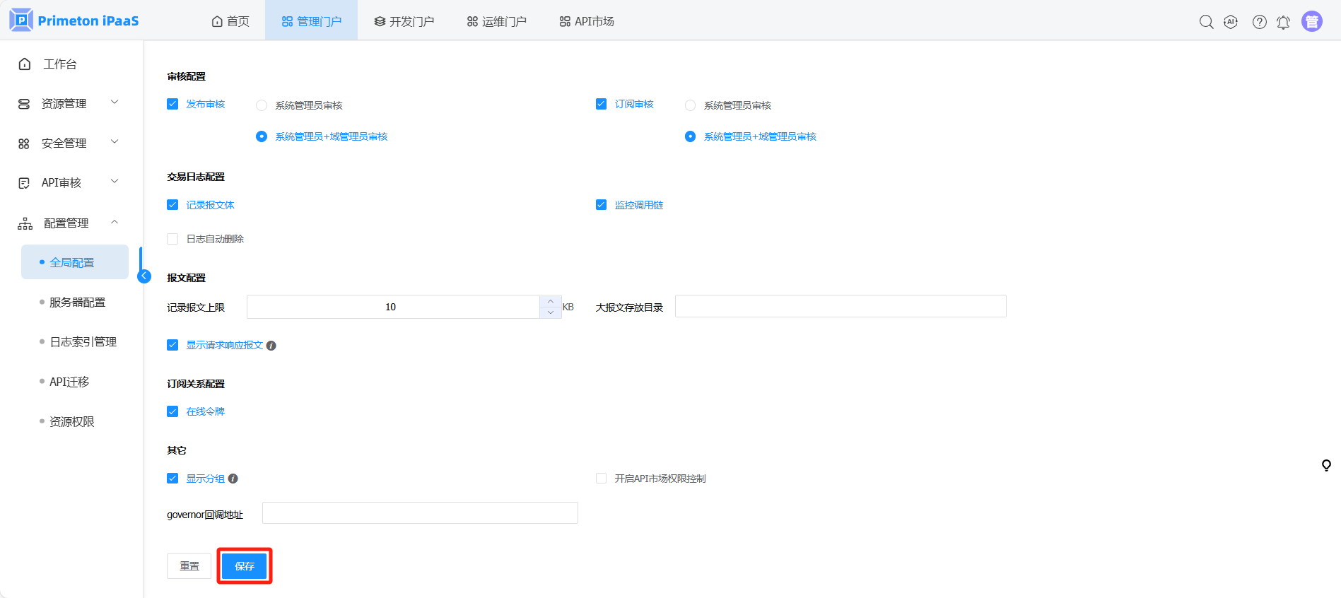 使用账号 manager(默认密码:000000)登录系统,点击管理门户,进入“配置管理>全局配置”页面。