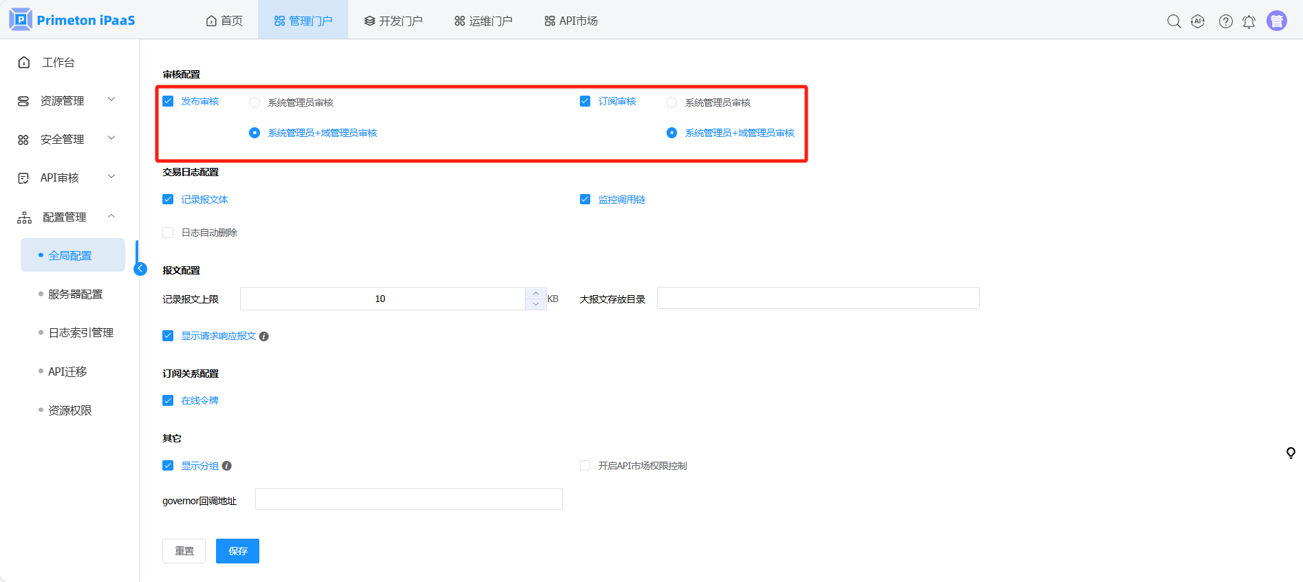 在全局配置页面,“审核配置”栏中勾选“发布审核”和“订阅审核”,并选择“系统管理员+域管理员审核”配置。