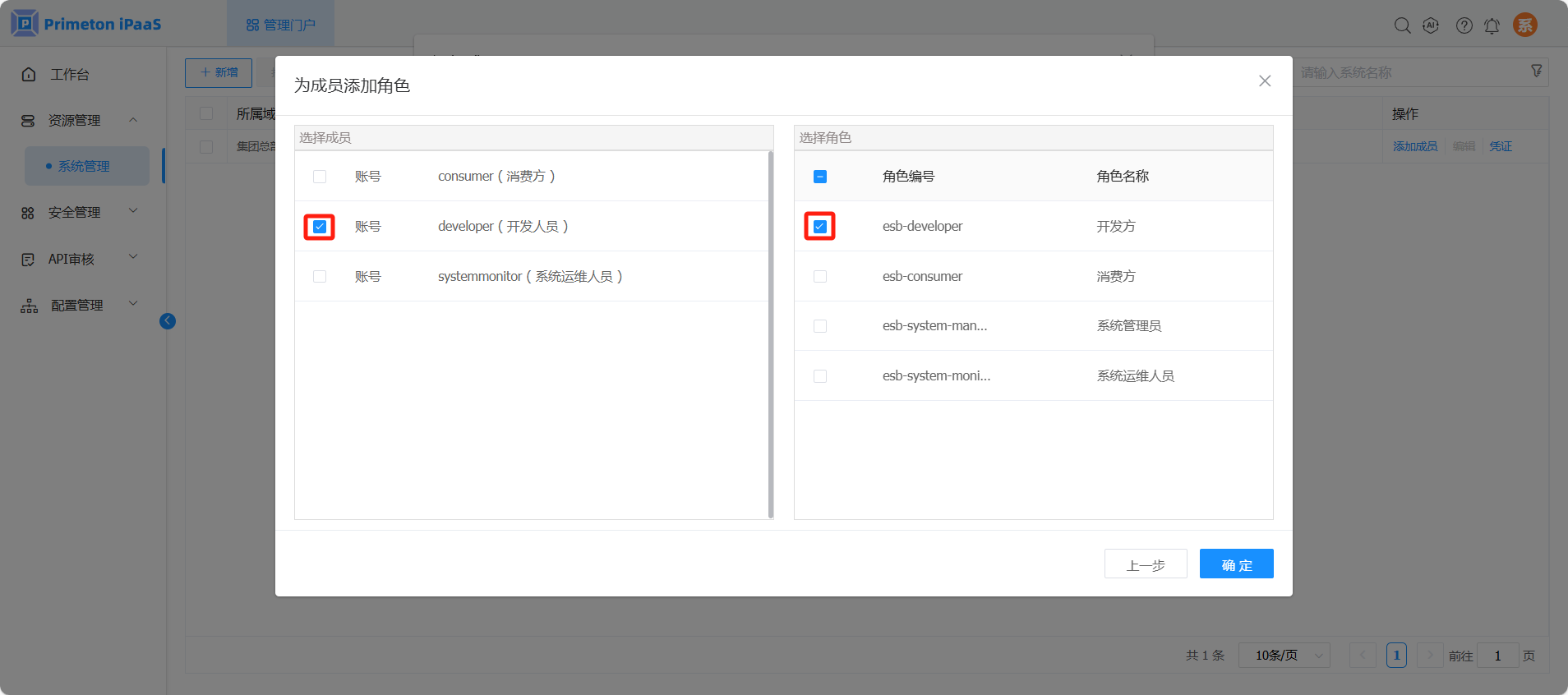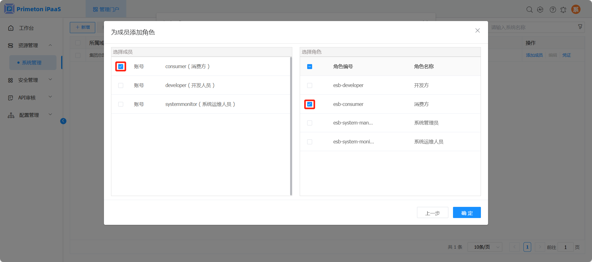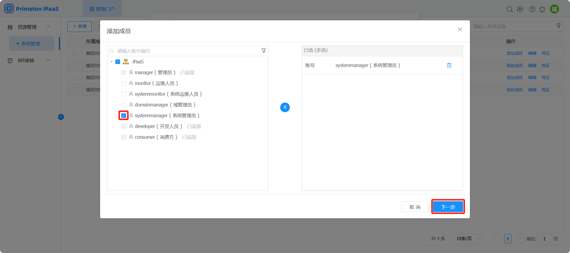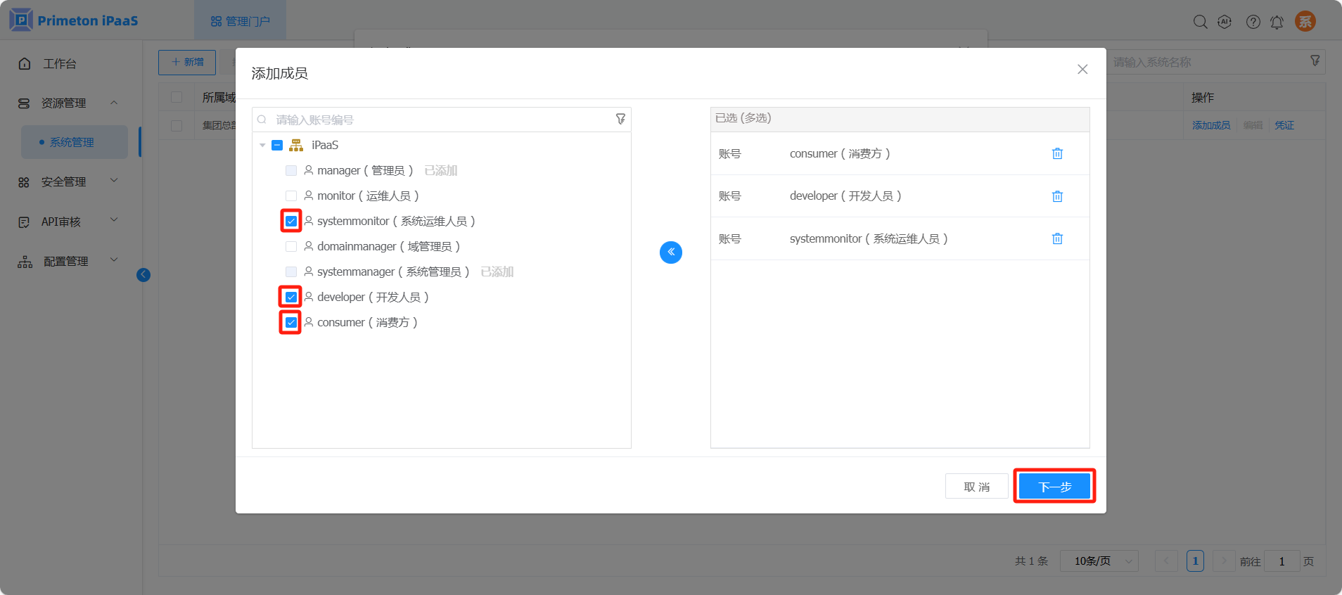 选择多个用户(此示例场景选择 systemmonitor、developer、consumer),点击“下一步”。