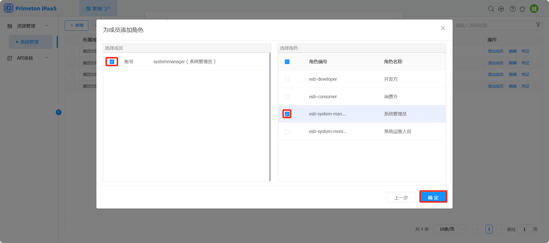 7,为用户配置角色“系统管理员”(esb-system-manager),配置完成后,点击“确定”按钮保存。