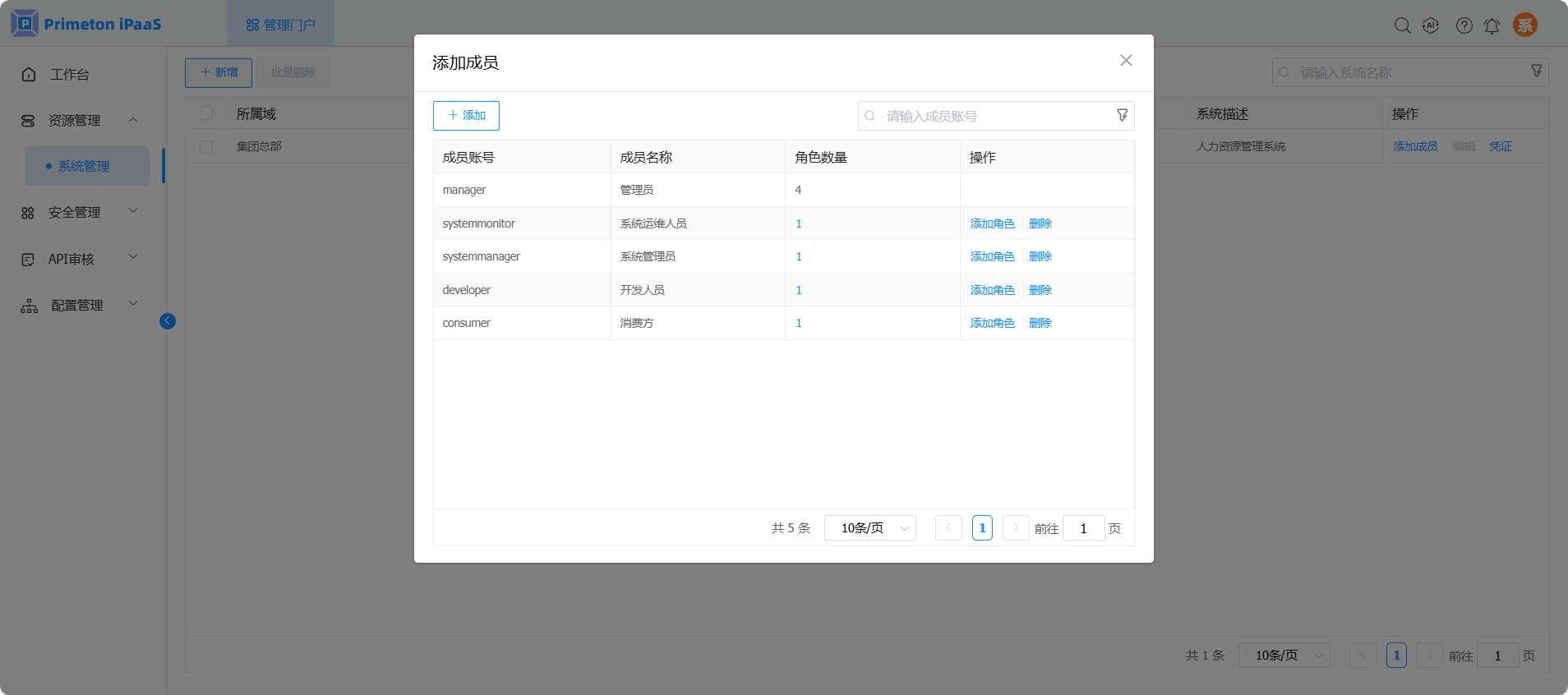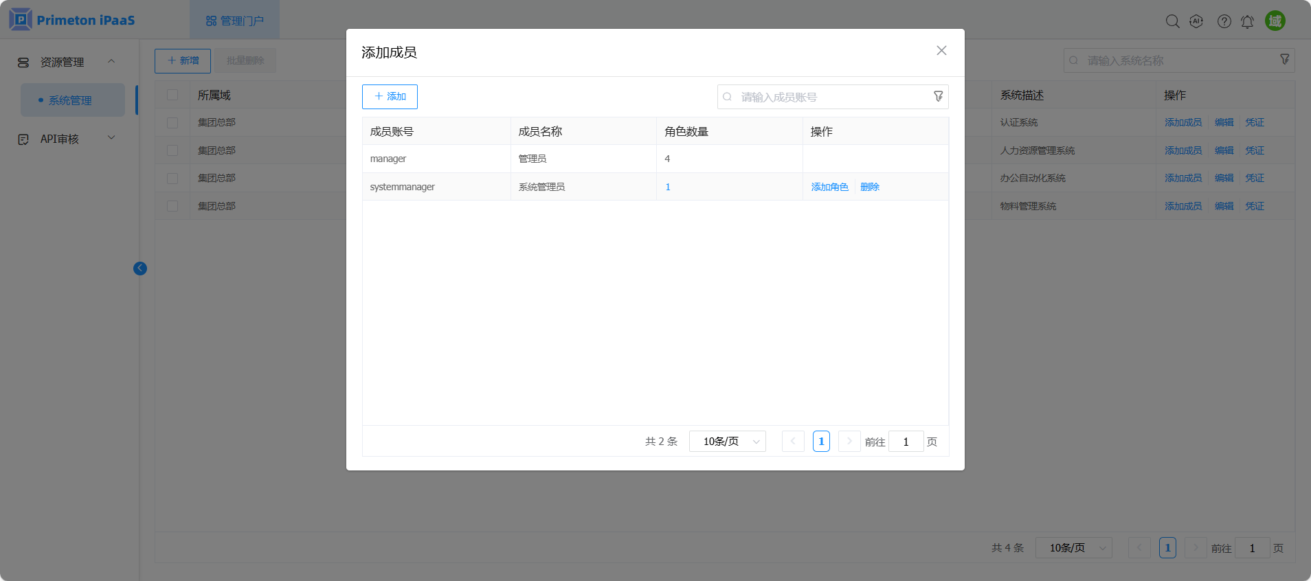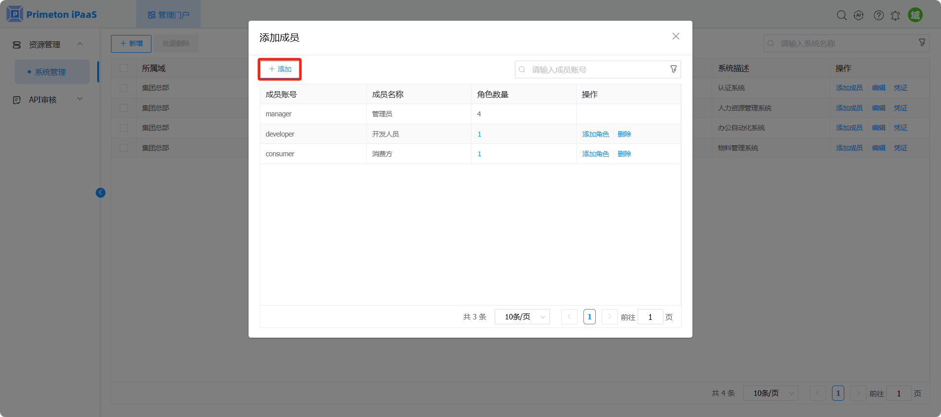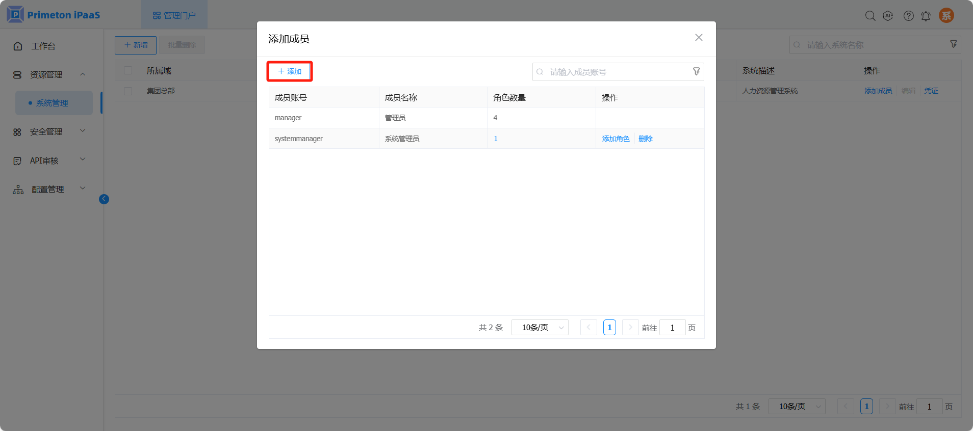 在系统成员配置页面。点击“添加”按钮,弹出添加成员页面
