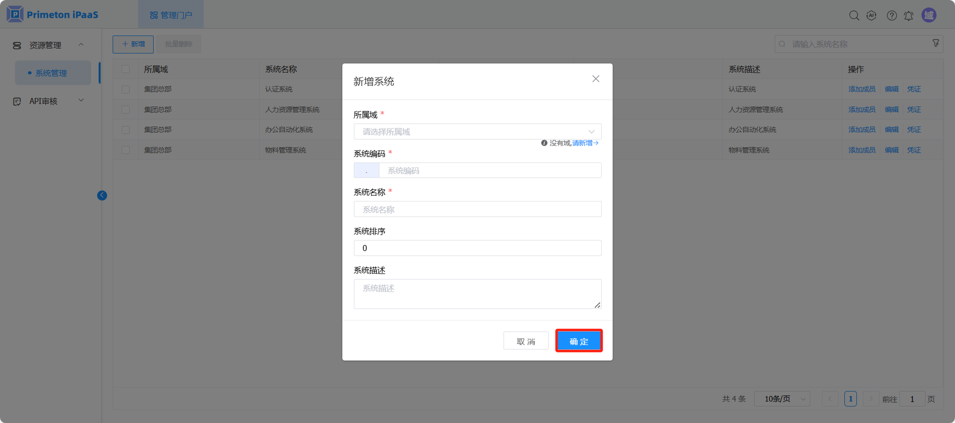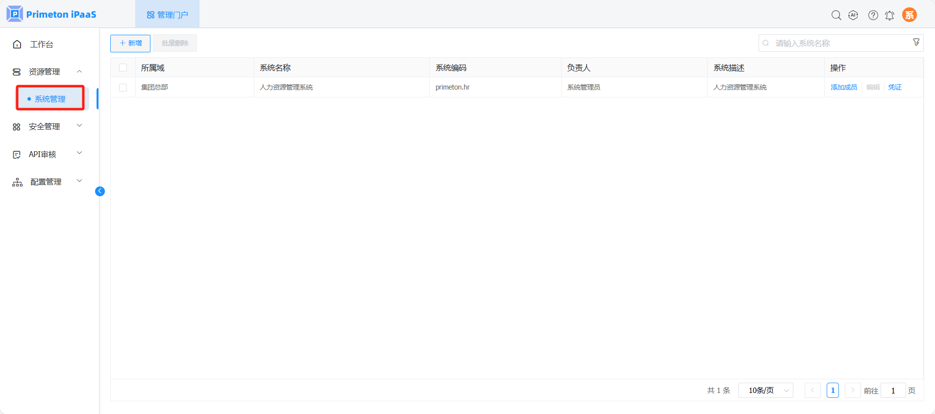 使用账号 systemmanager(默认密码:000000)登录系统,点击“管理门户”,进入“资源管理>系统管理”页面。