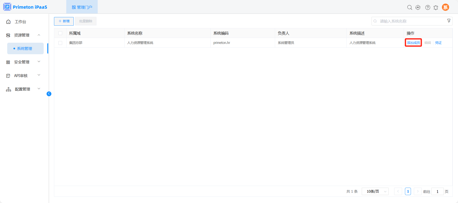 在“系统管理”页面。在系统列表,选择自己负责的系统,点击操作列“添加成员”按钮,弹出系统成员配置页面。