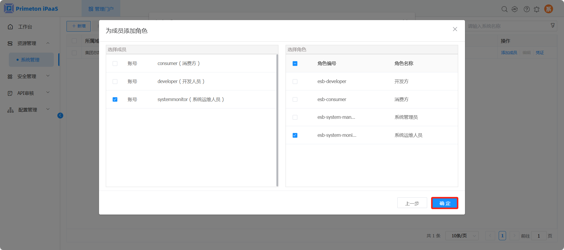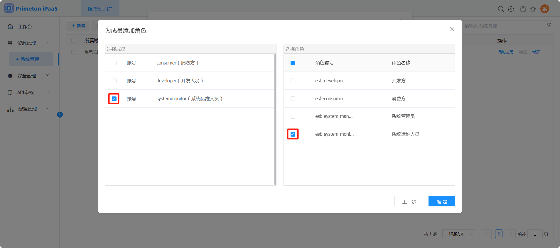 为用户“systemmonitor”配置角色“系统运维人员”(esb-system-monitor)。