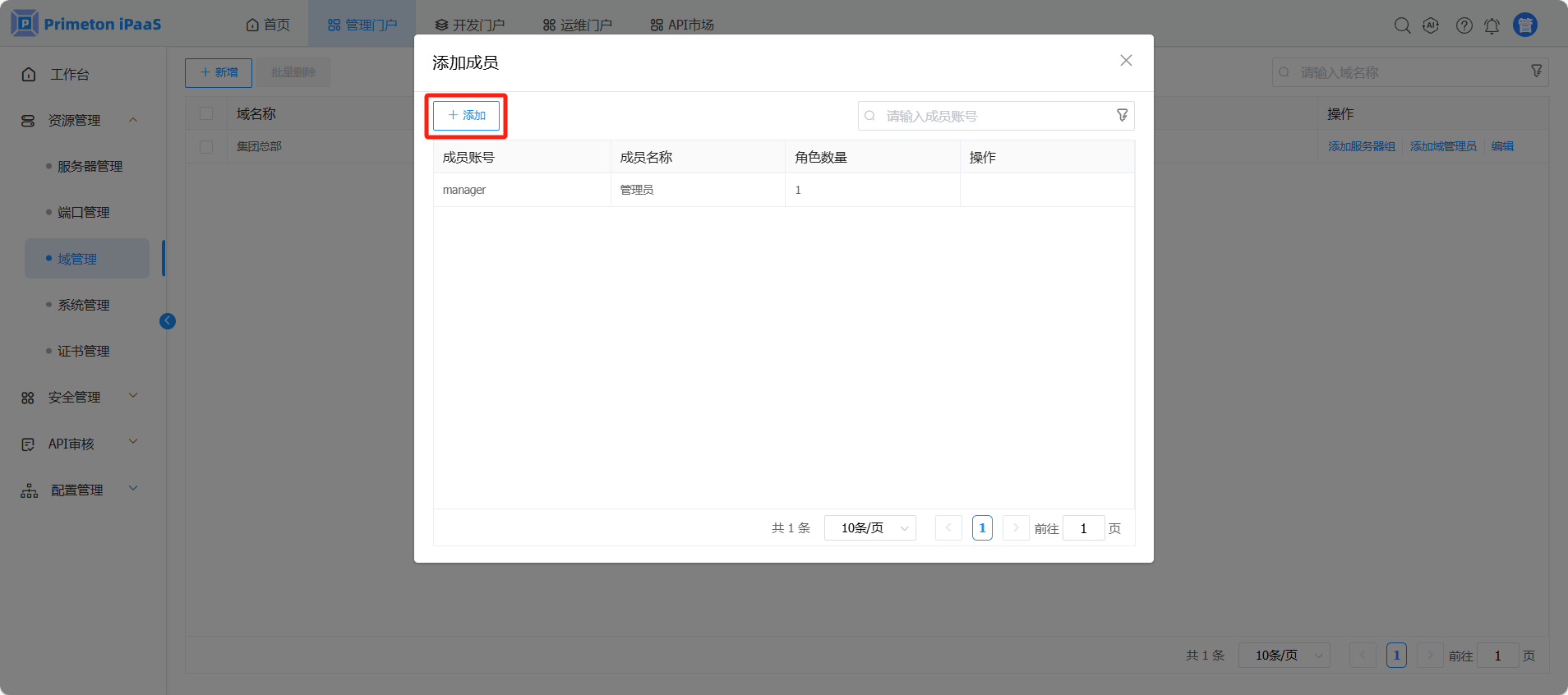 点击“添加”按钮,弹出添加成员页面。