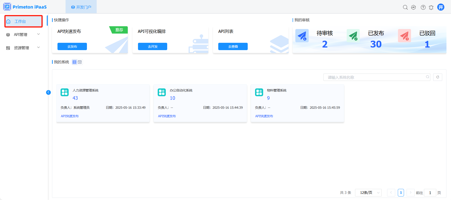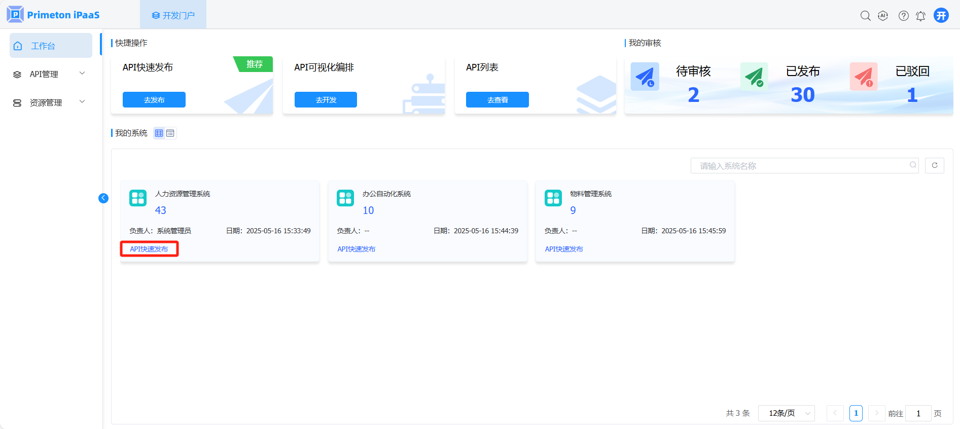 “工作台”页面,在“我的系统”栏中,查看当前用户已拥有的系统,点击系统卡片上的“API快速发布”按钮,弹出“API快速发布”弹窗。