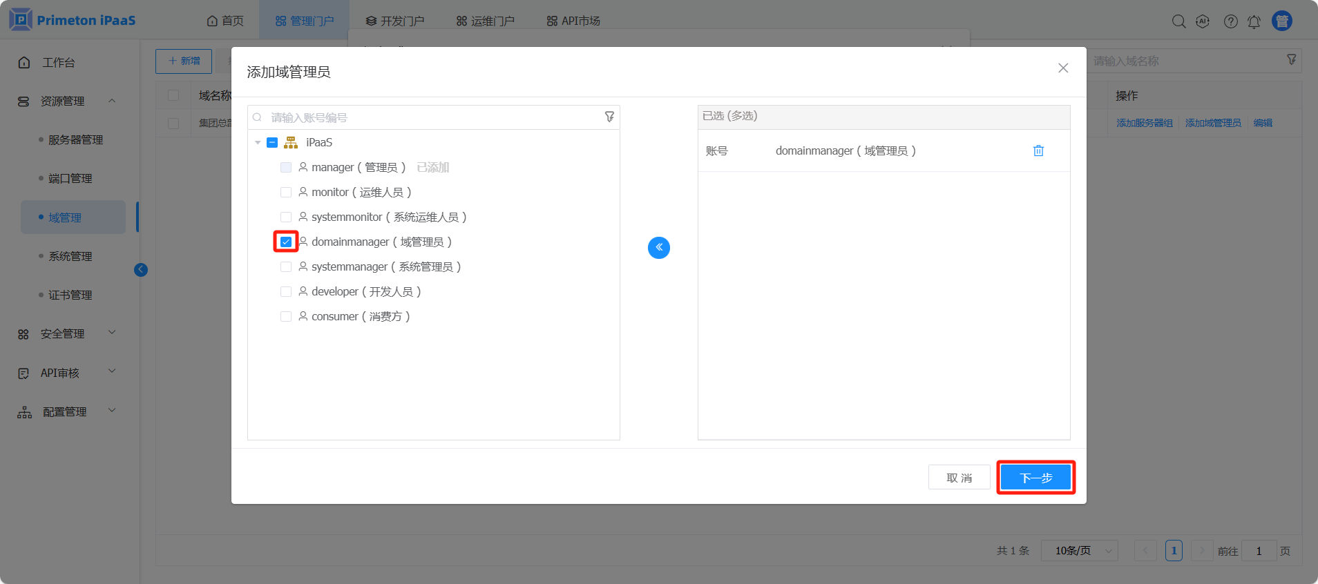 选择一个或多个用户(此示例场景选择“domainmanager”),点击“下一步”。