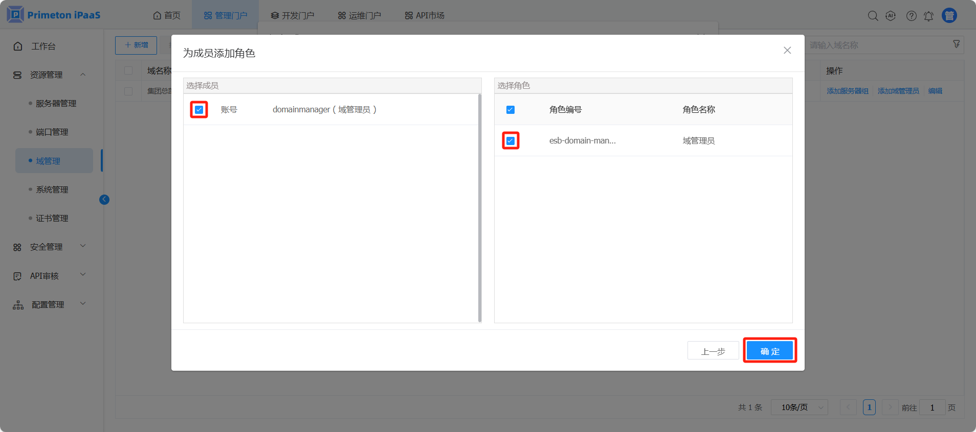 为用户配置“域管理员”角色(esb-domain-manager),配置完成后,点击“确定”保存。