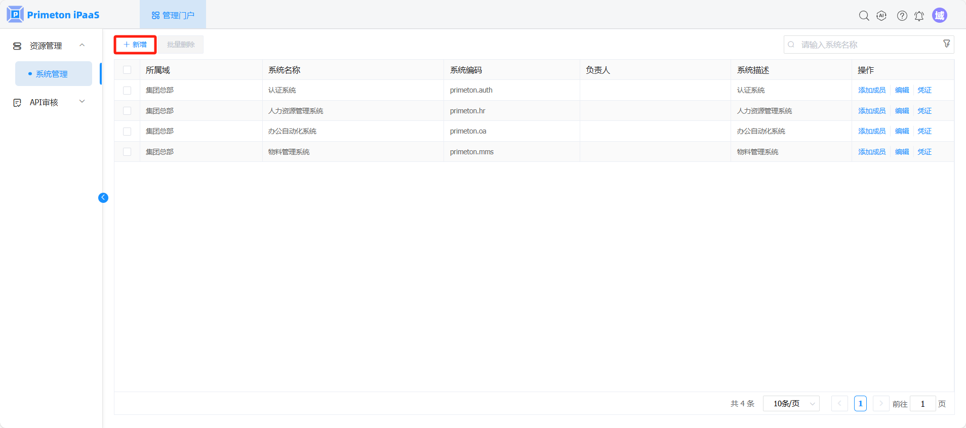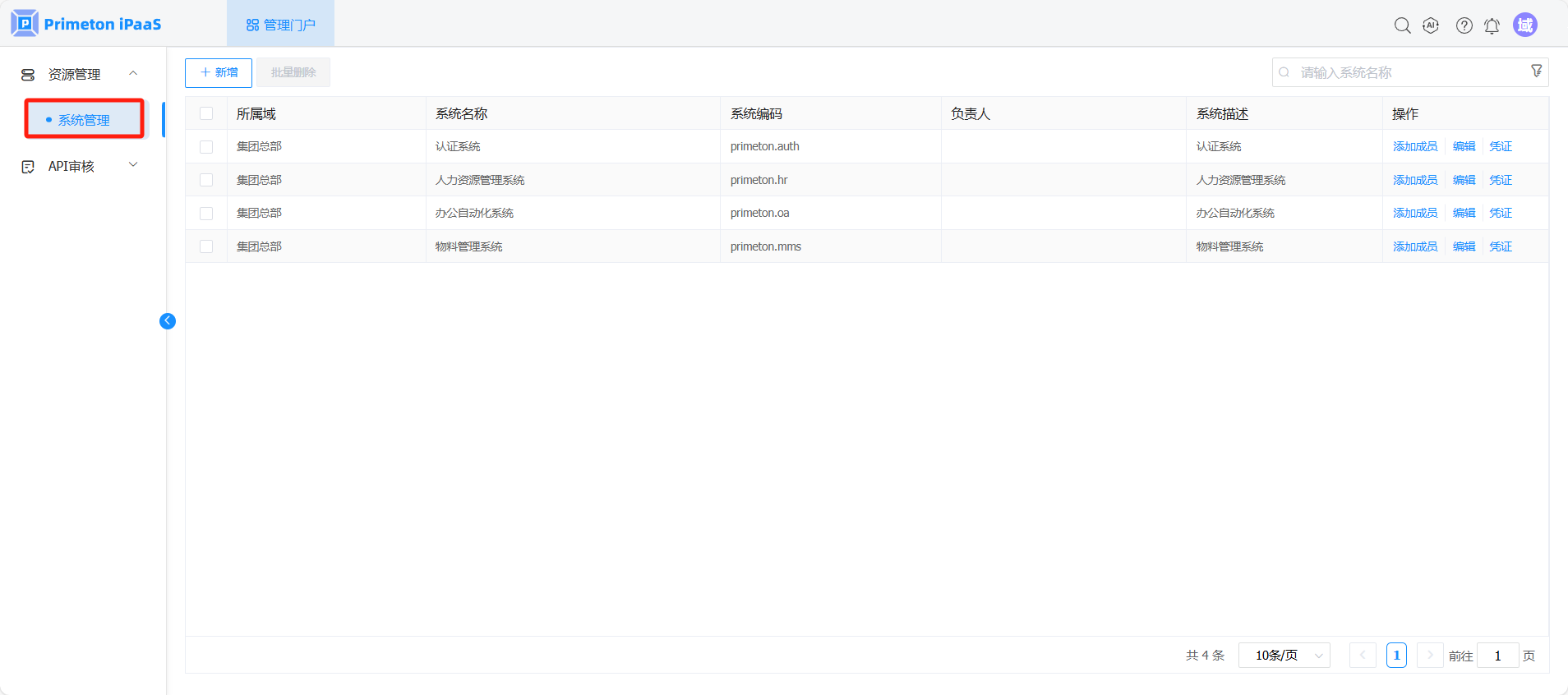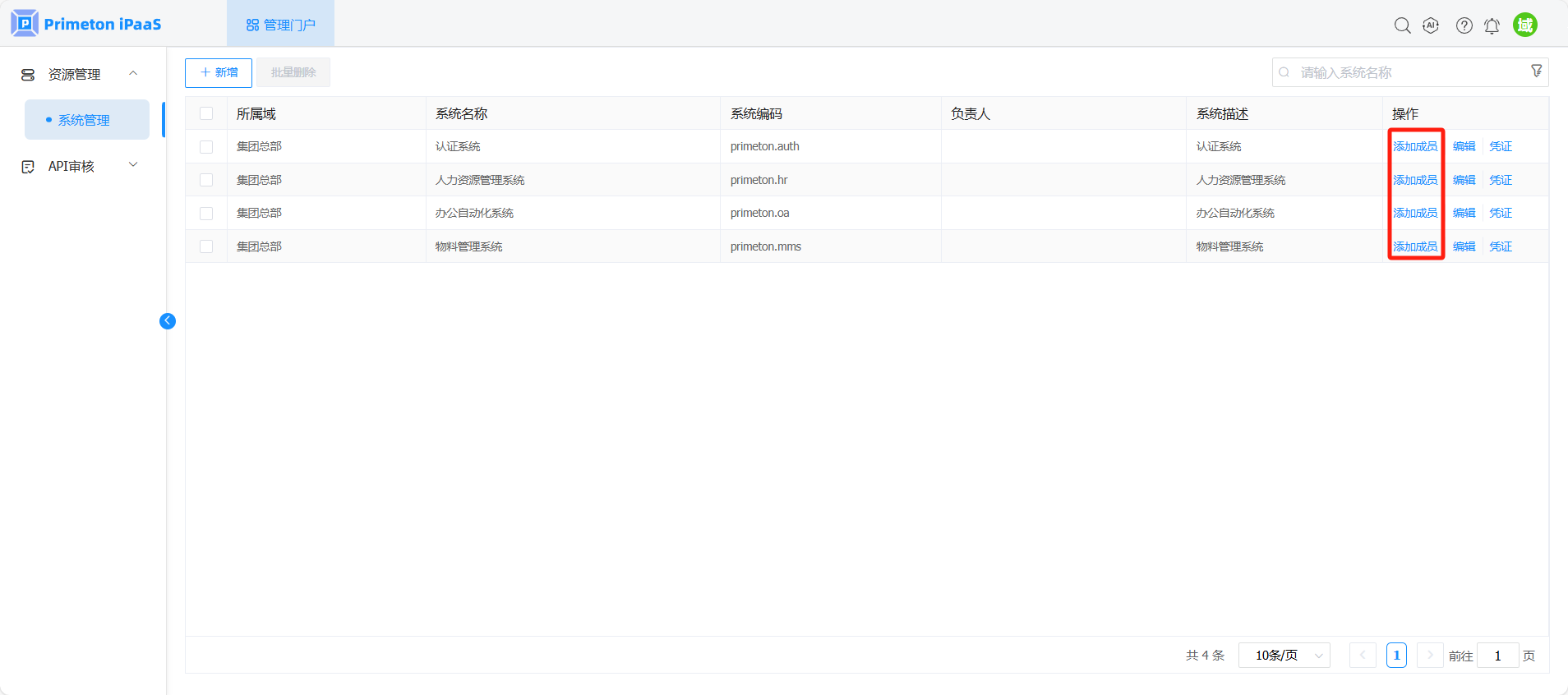 域管理员拥有在当前域下新增系统、编辑系统、删除系统、为系统添加成员的权限。