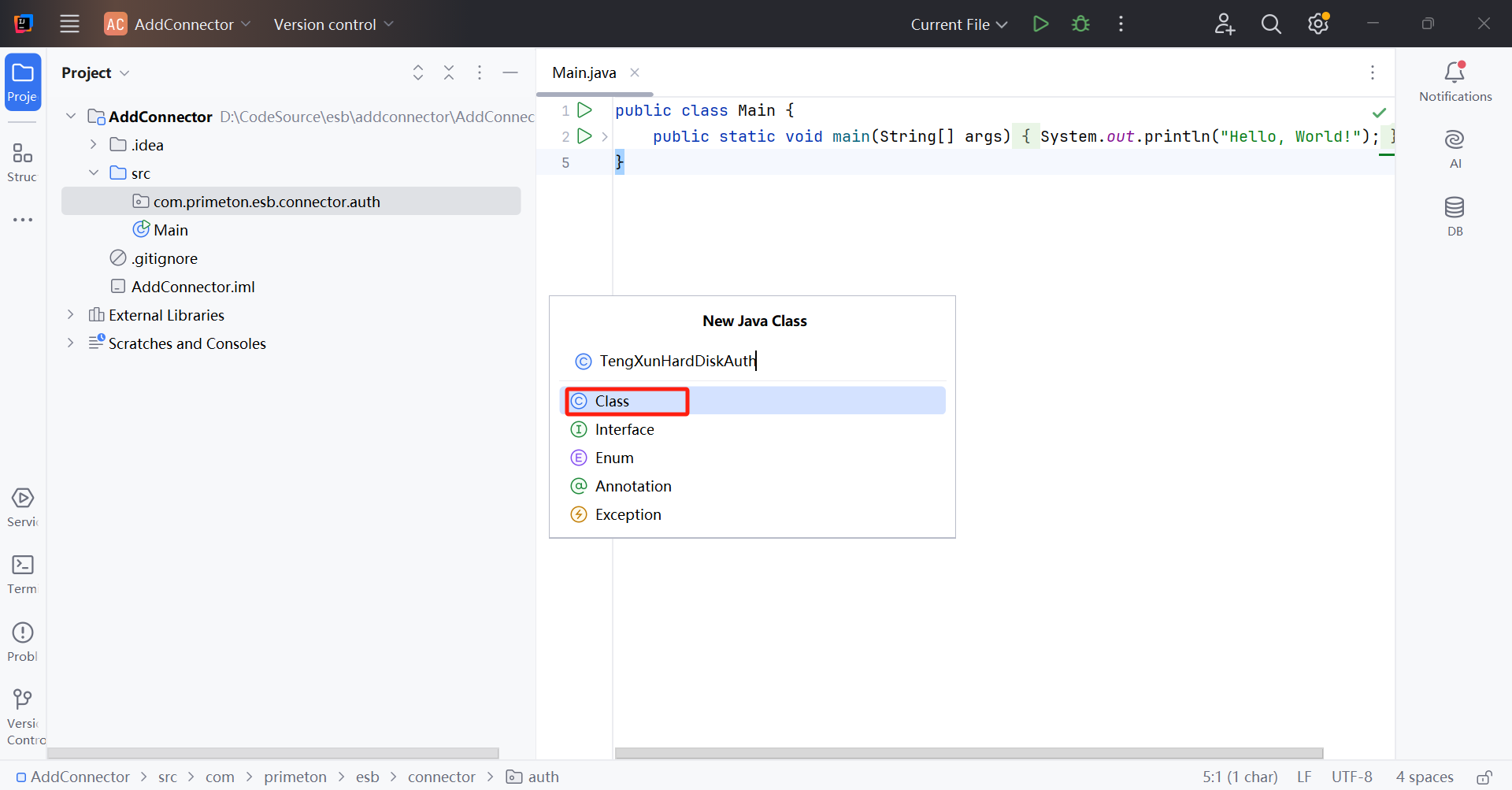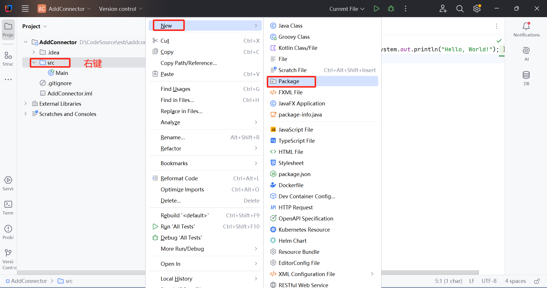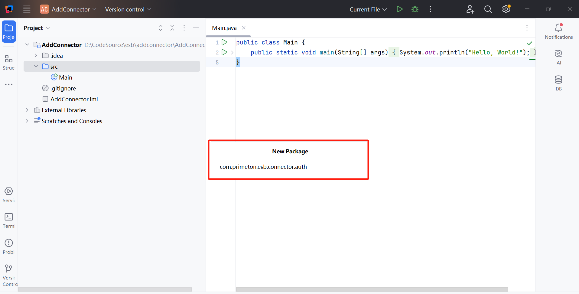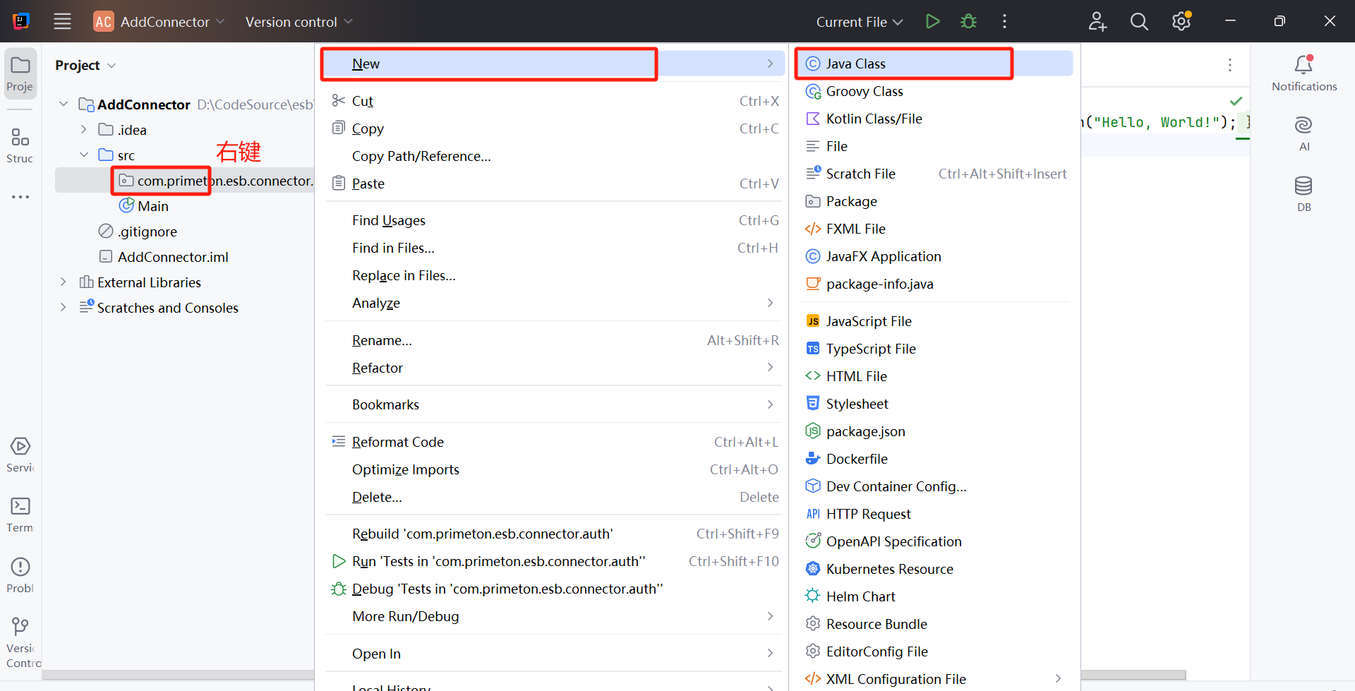 右击src目录,选择“New>Package"创建路径为“com.primeton.esb.connector.auth”的包。