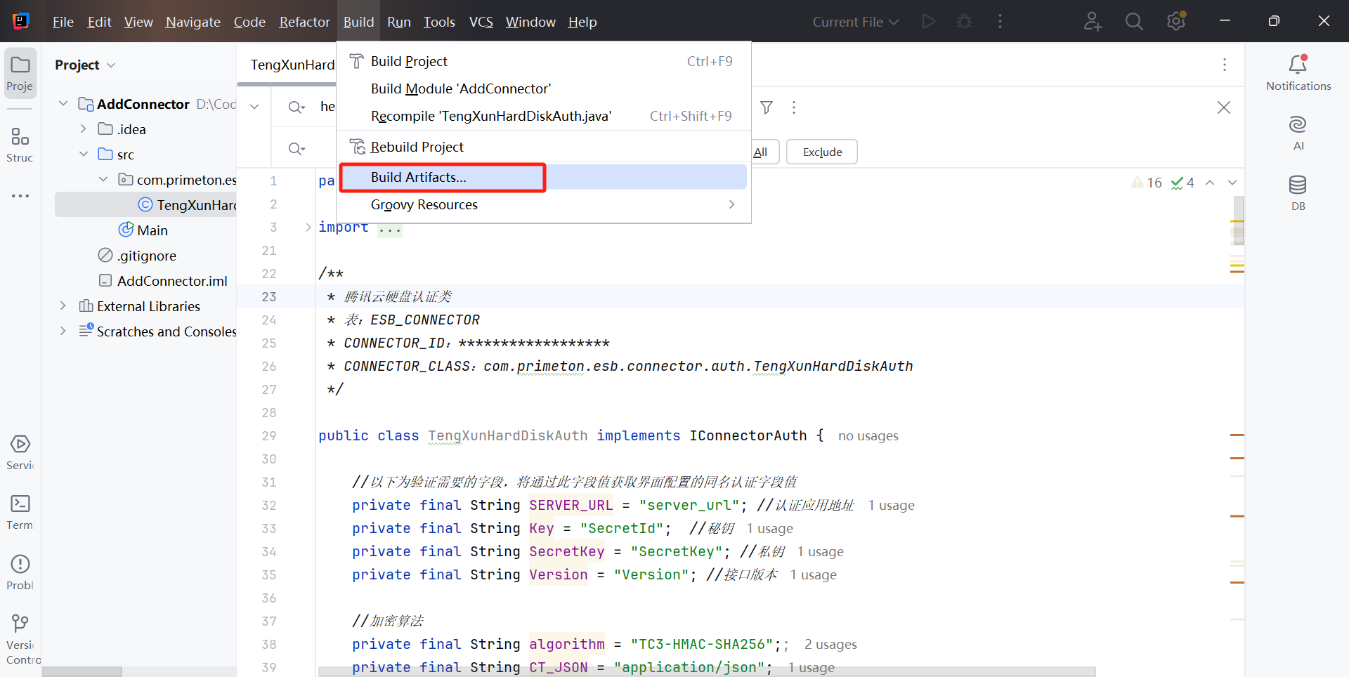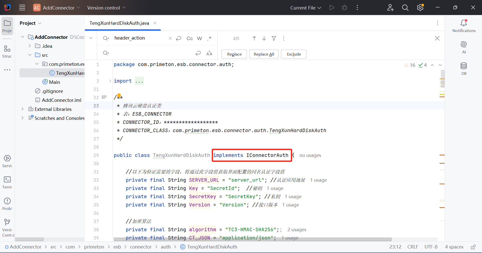 根据新增应用连接器的认证的实现逻辑,类“TengXunHardDiskAuth” 实现 接口类 “com.primeton.esb.httpcomponent.client.nio.auth.api.IConnectorAuth”,并实现 auth(IESBHttpMessage message) 与 flushToken(String authId, TokenEntity dbToken) 函数。