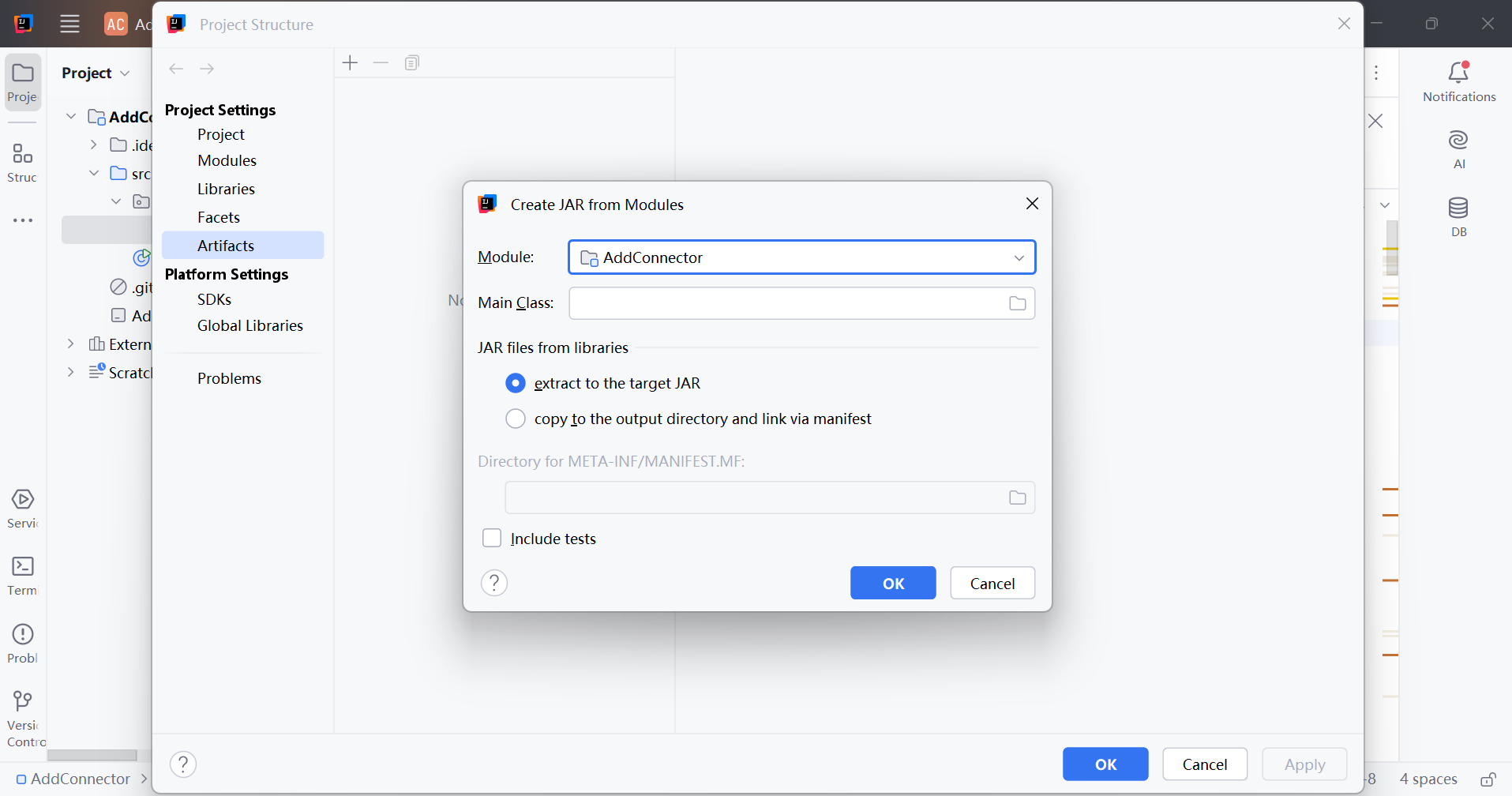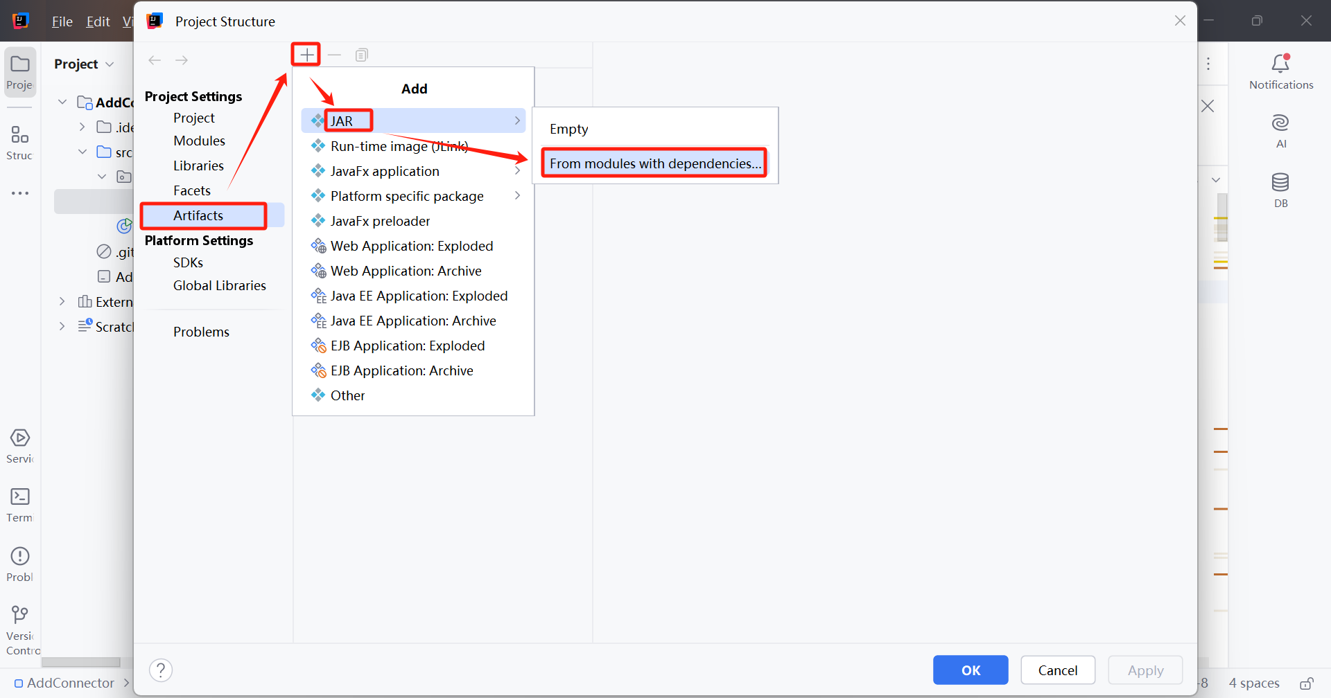 在项目配置界面,进入“Project Settings>Artifacts"选项,点击“+”按钮,选择“Jar”选项,点击“From modules with depen…”按钮。