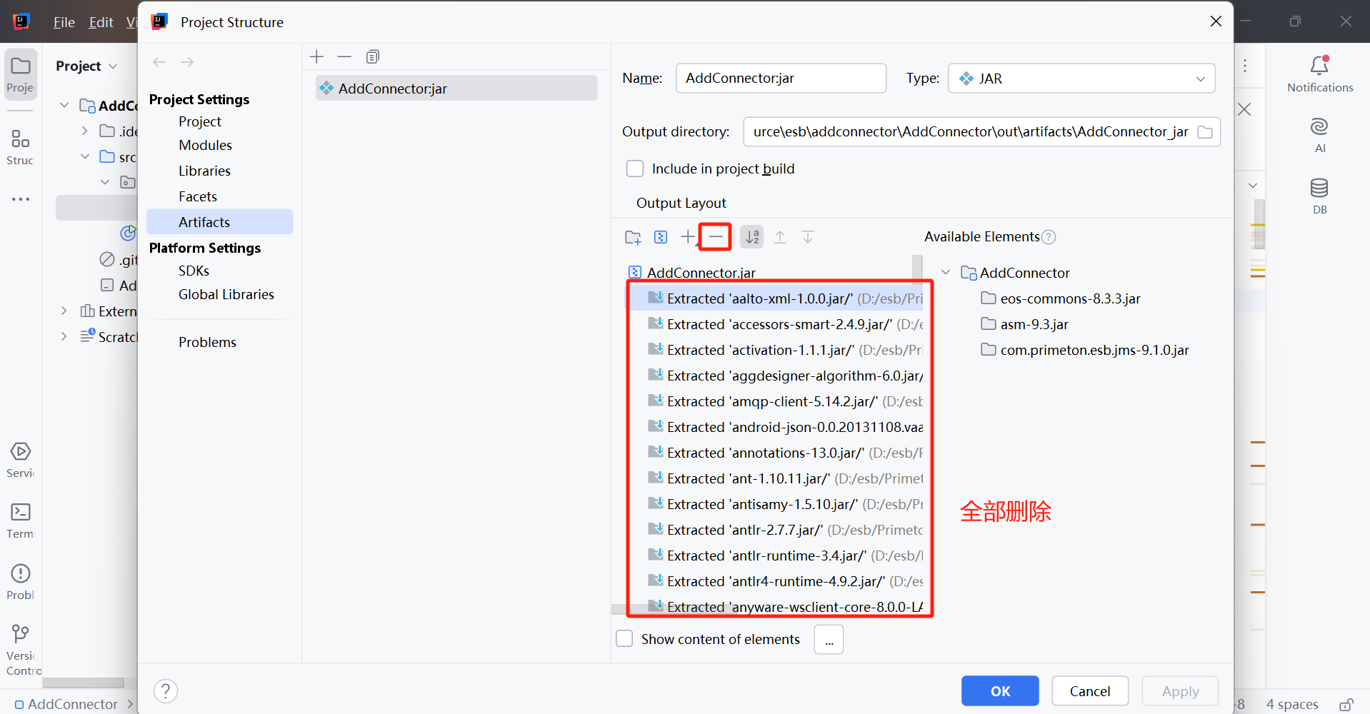 此次生成的Jar包无需引入第三方依赖Jar,因此删除所有第三方Jar,只保留该项目的输出目录。