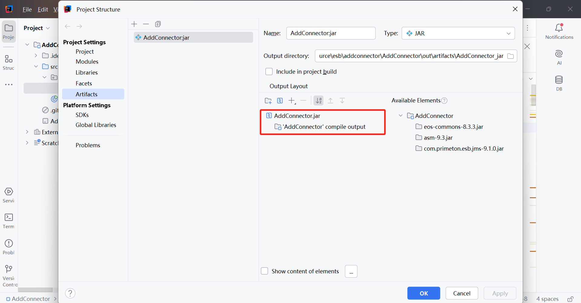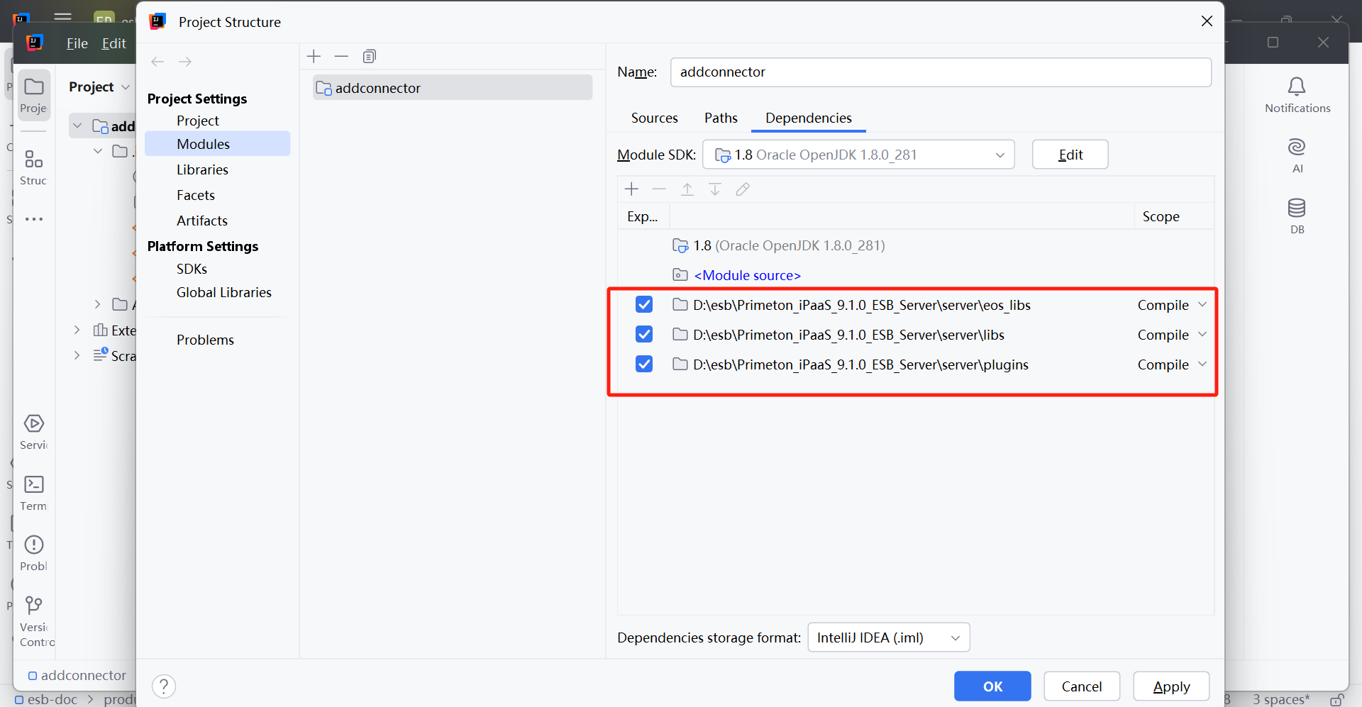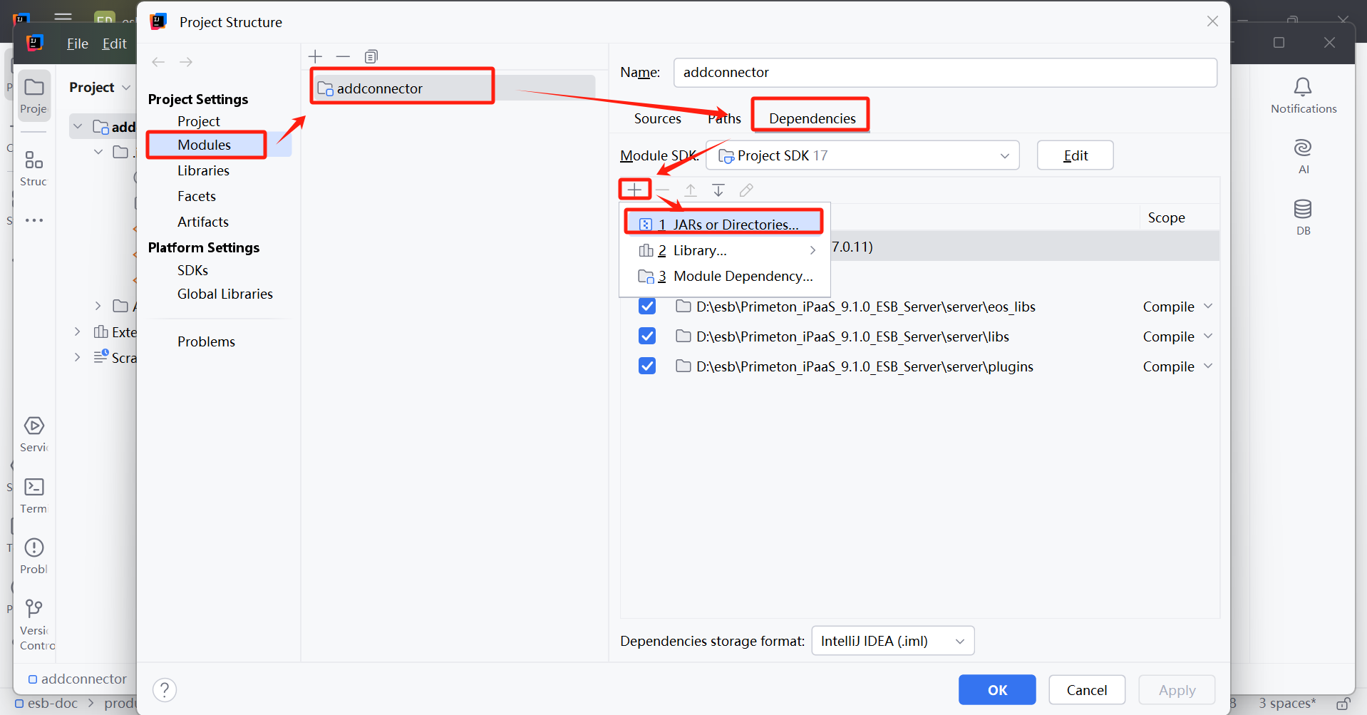 在项目配置界面,进入“Project Settings>Modules"选项,选择应用名称,在右侧界面点击“dependencies”页签,点击“+”按钮,选择“JARs or Directories”选项,添加上步骤中获取的ESB Server 相关jar。