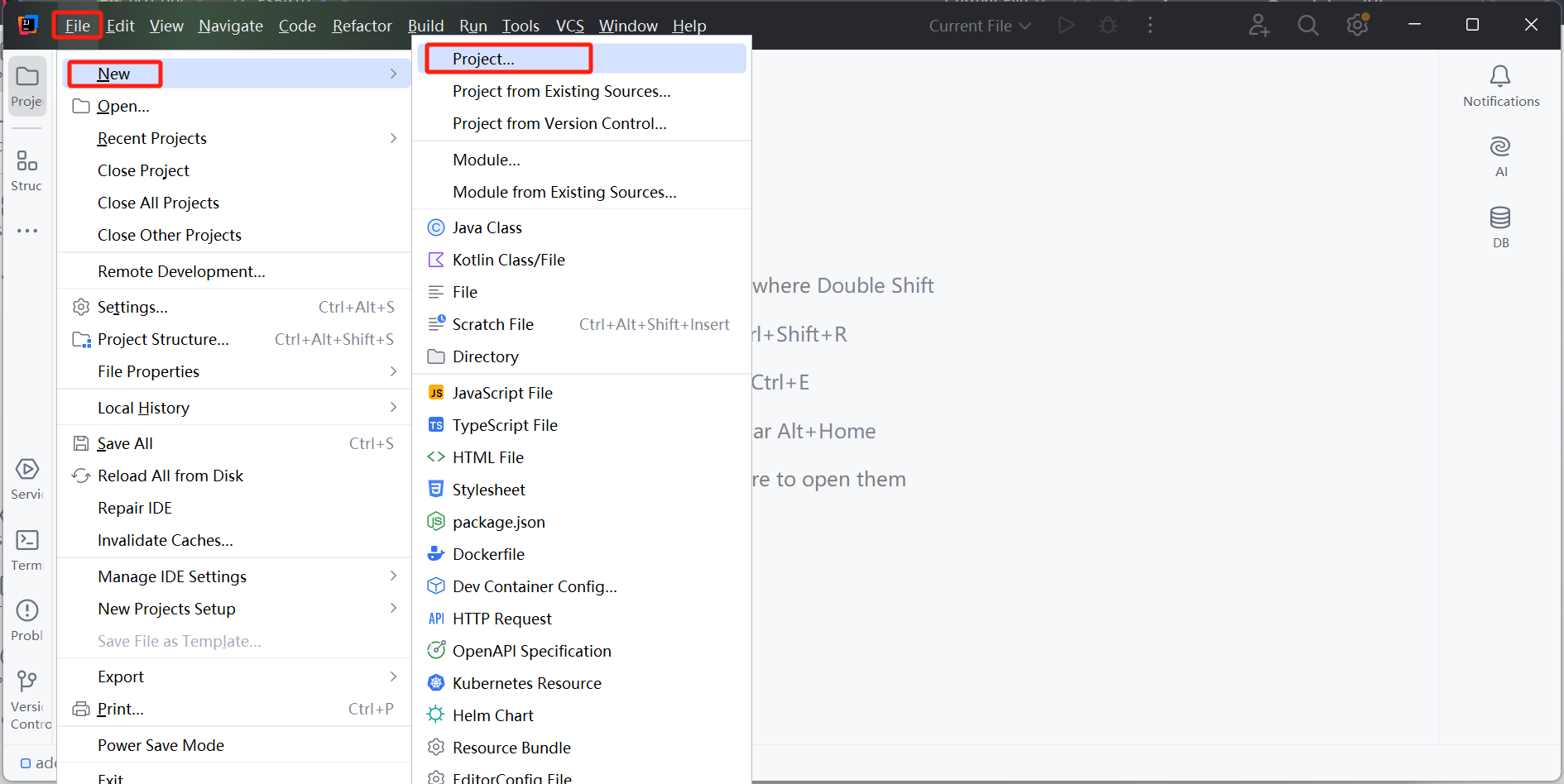 在idea操作界面中,选择“File>New>Project"选项,打开创建项目界面。