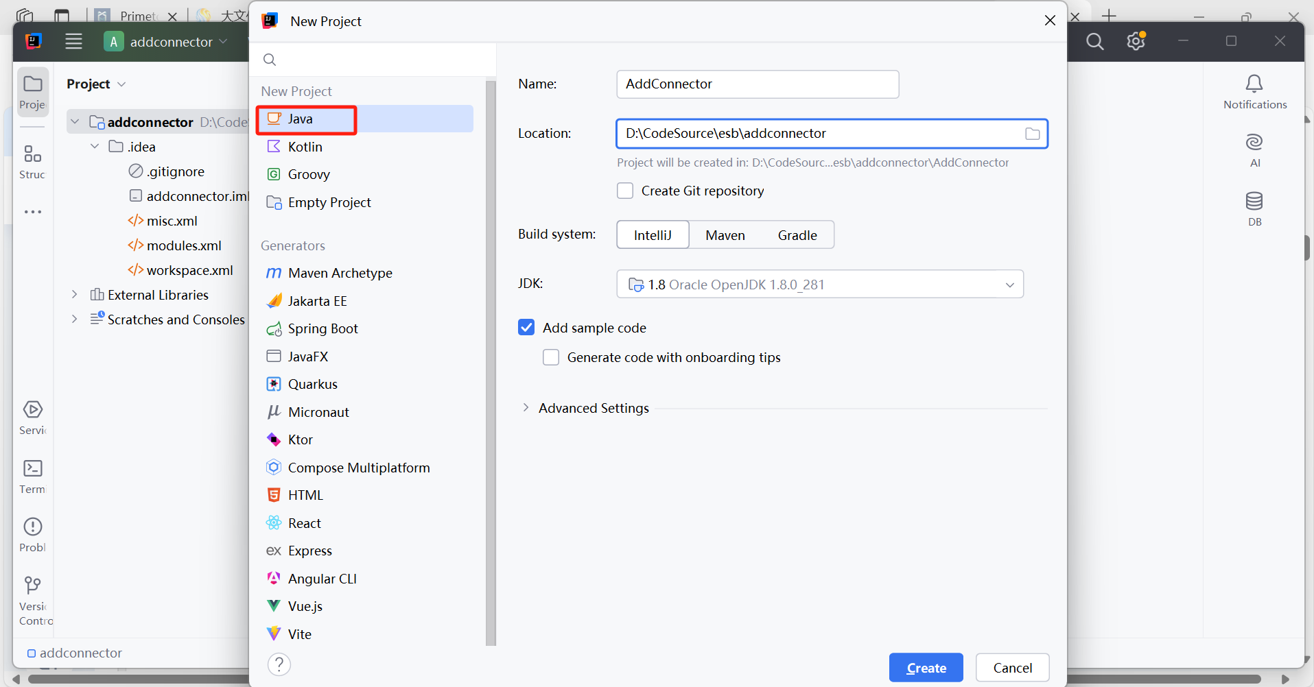 在i创建项目界面,选择“java"选项,填写应用名称及应用所在目录,点击确认按钮,完成新项目创建。