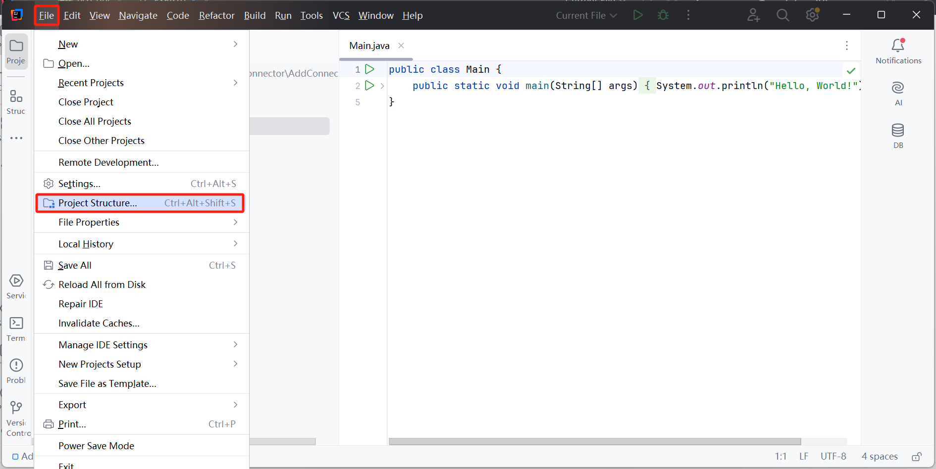 在新项目界面中,选择“File>Project Structure"选项,打开项目配置界面。
