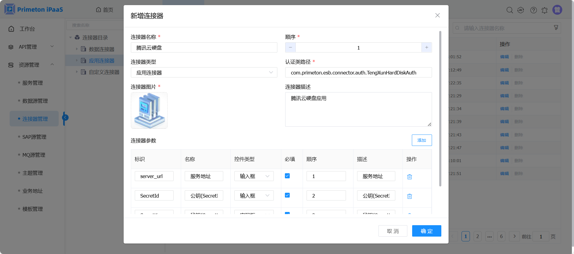 4. 在接器新增页面,参考字段说明,填写连接器新增,点击“确定”按钮保存数据。