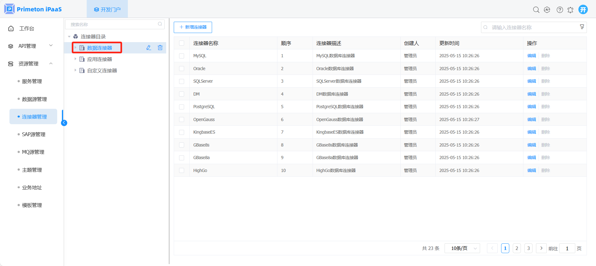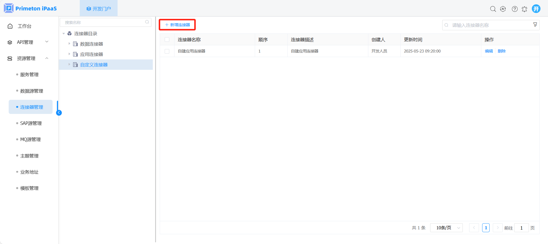 1. 开发人员登录系统,进入开发门户,点击菜单“资源管理“ >“连接器管理” ,右侧区域显示 “连接器管理”界面。