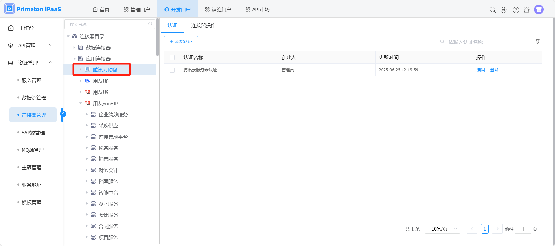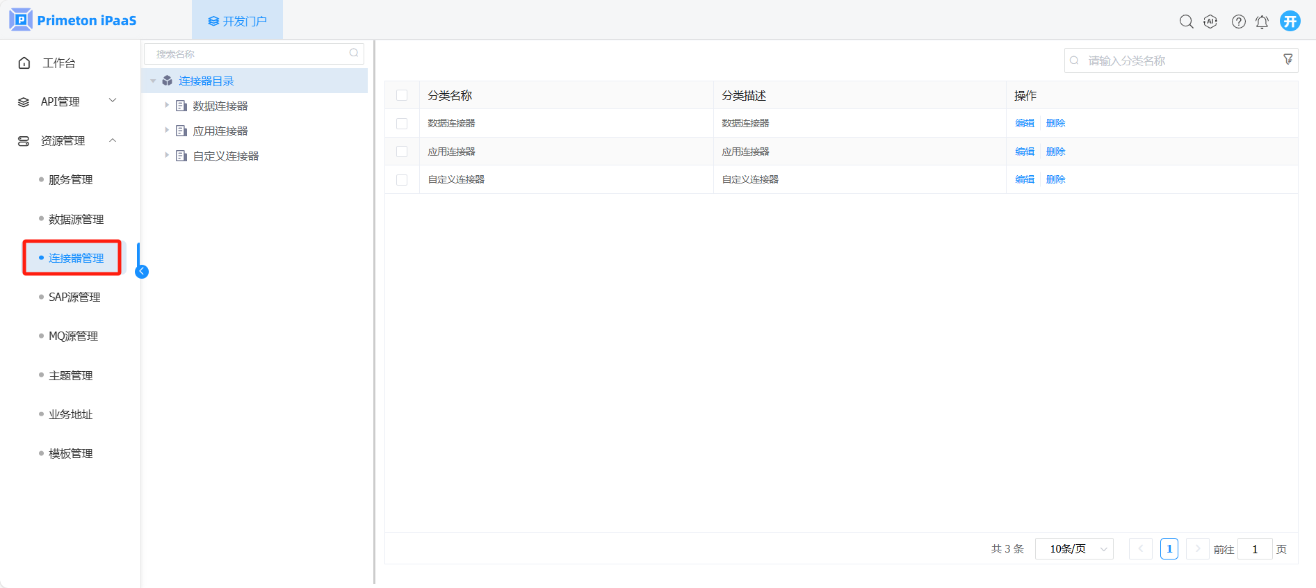 1. 开发人员登录系统,进入开发门户,点击菜单“资源管理“ >“连接器管理” ,右侧区域显示 “连接器管理”界面。