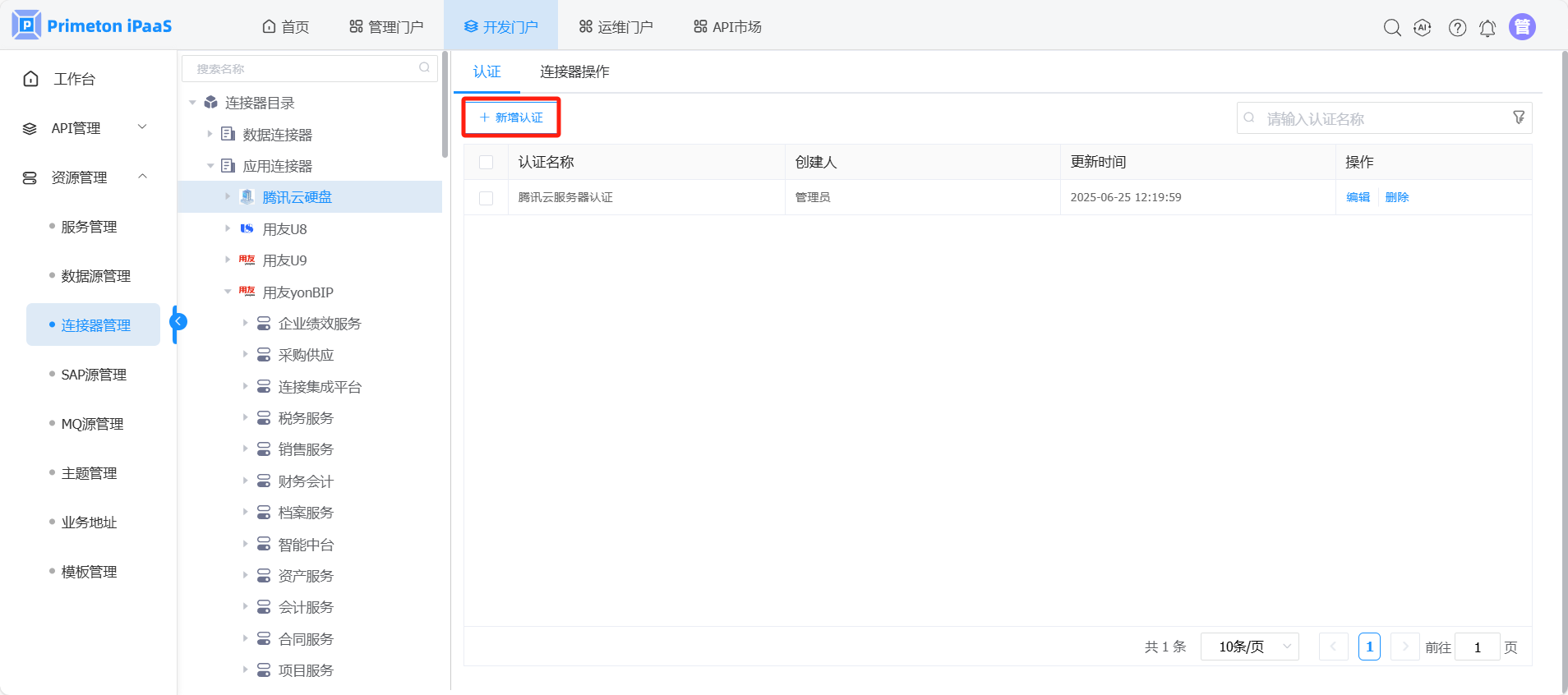 2. 在左侧树选择需要新增认证的连接器节点,右侧展示属于该连接器的认证列表及连接器操作列表。