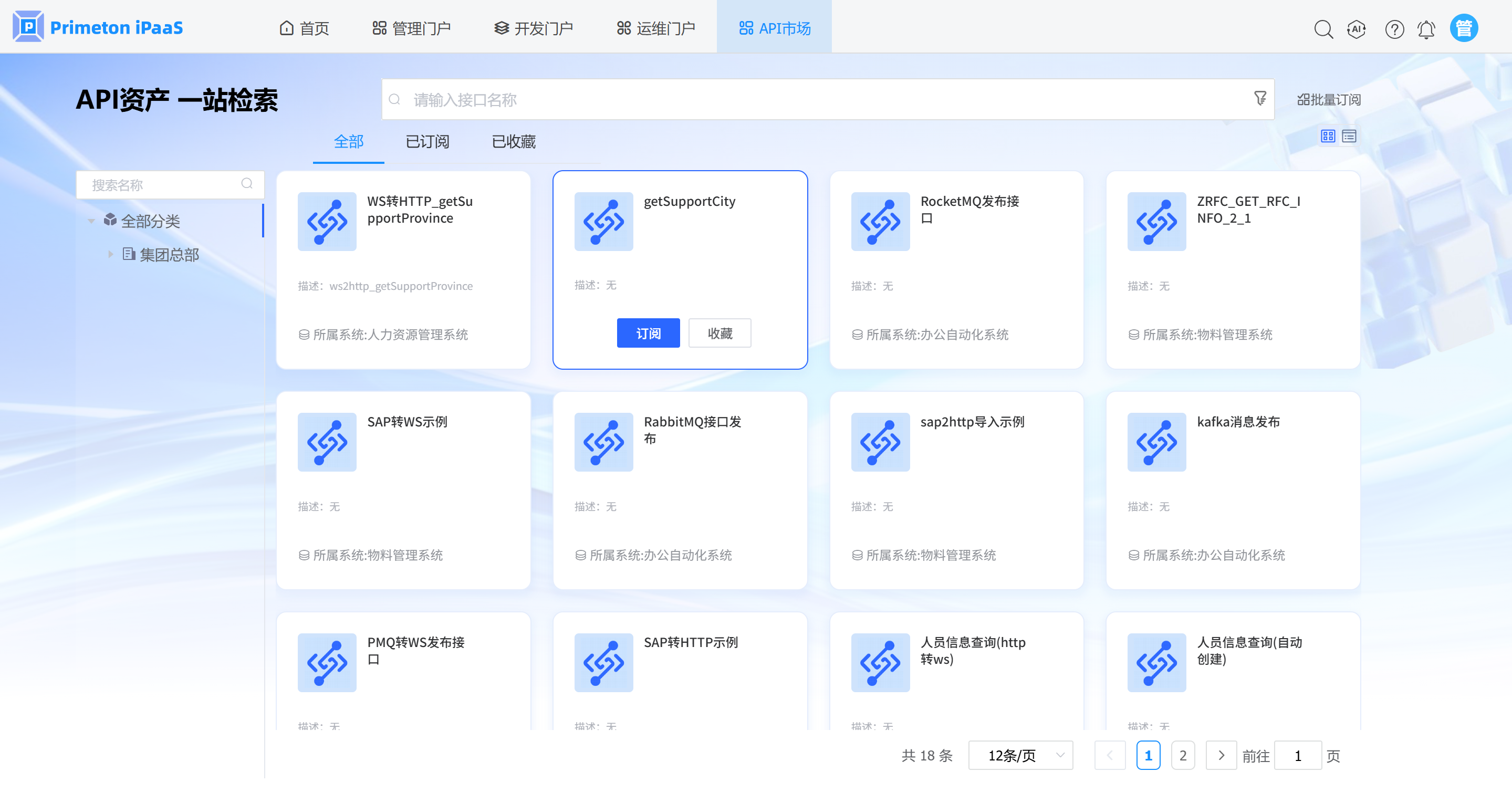 使用manager账号(默认密码:000000)登录系统,点击API市场,进入API市场门户的API市场页面。