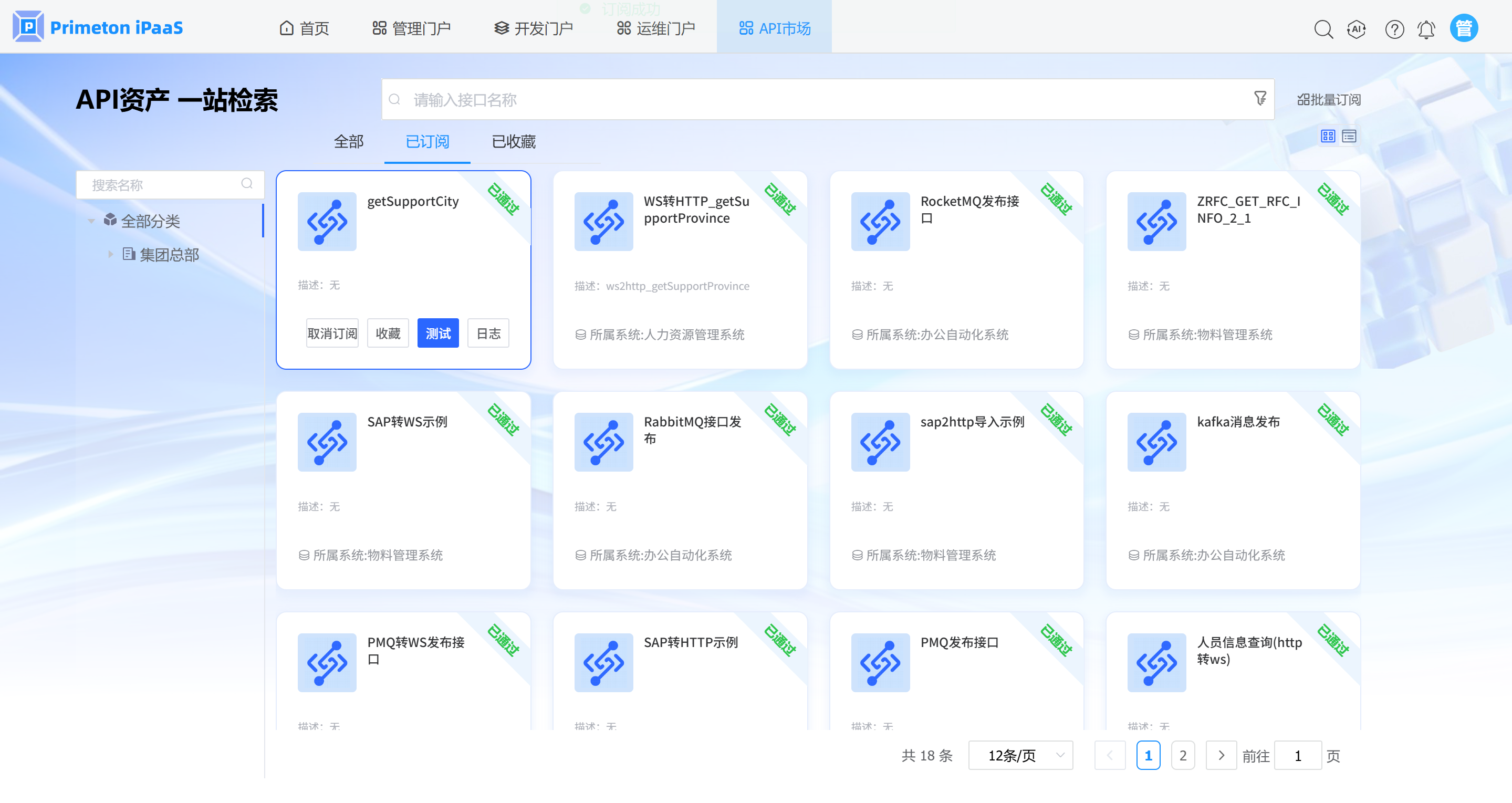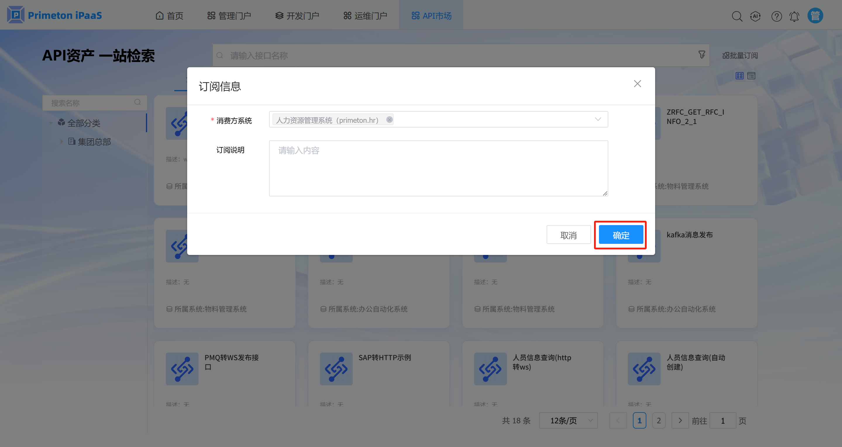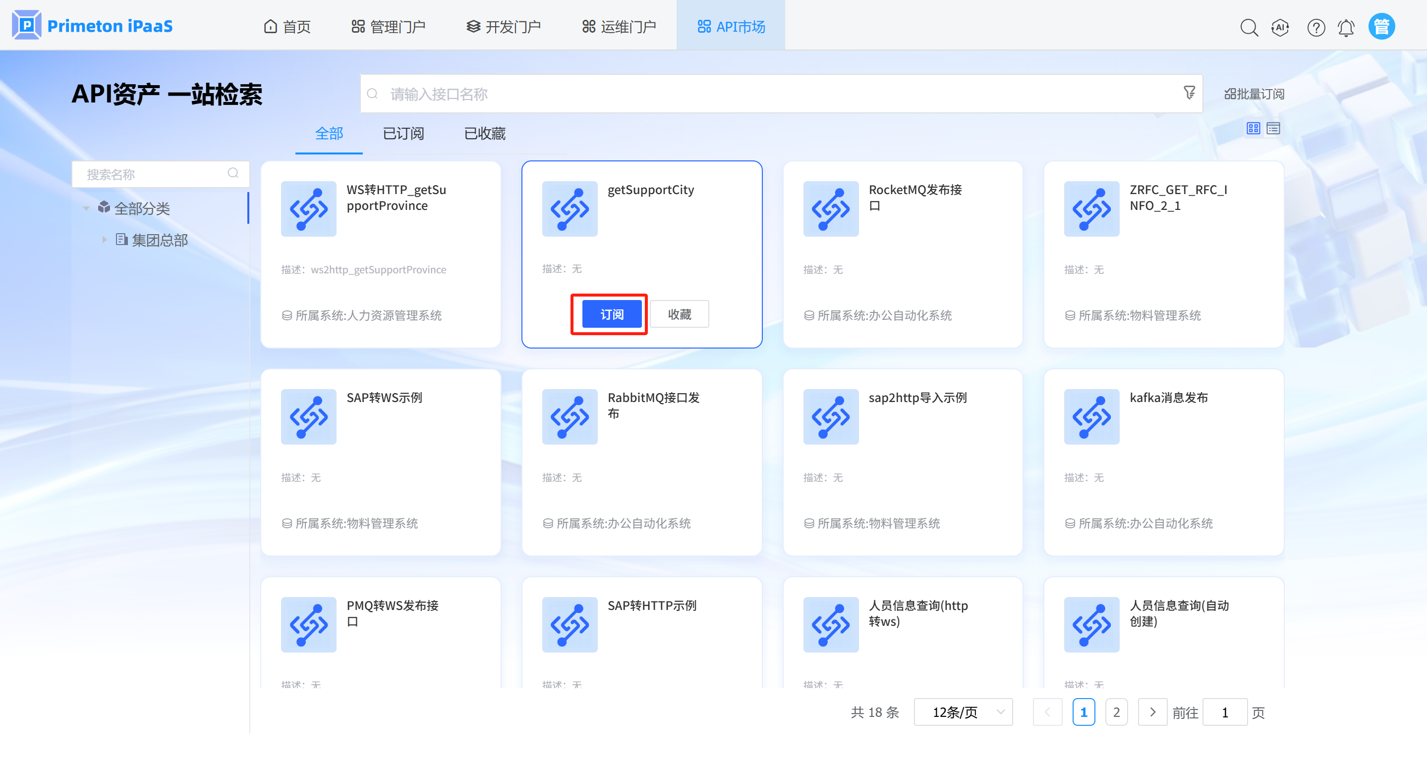 点击API资产全部列表中,选择需要订阅的API,点击API卡片中的“订阅”按钮,进入到API订阅页面。