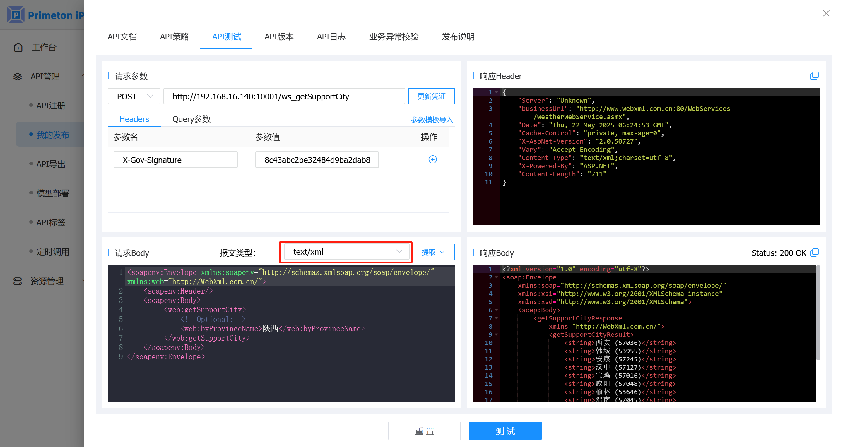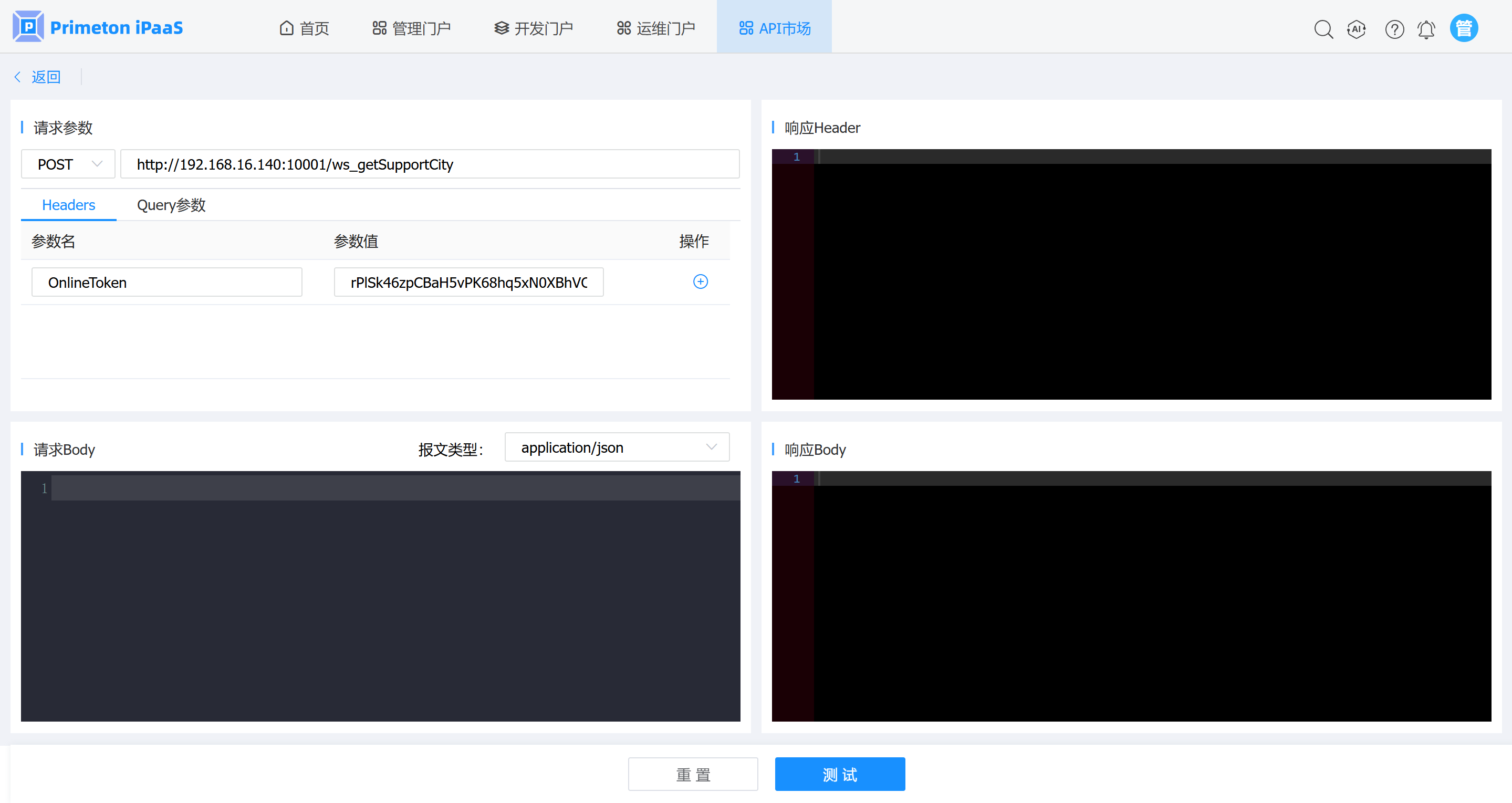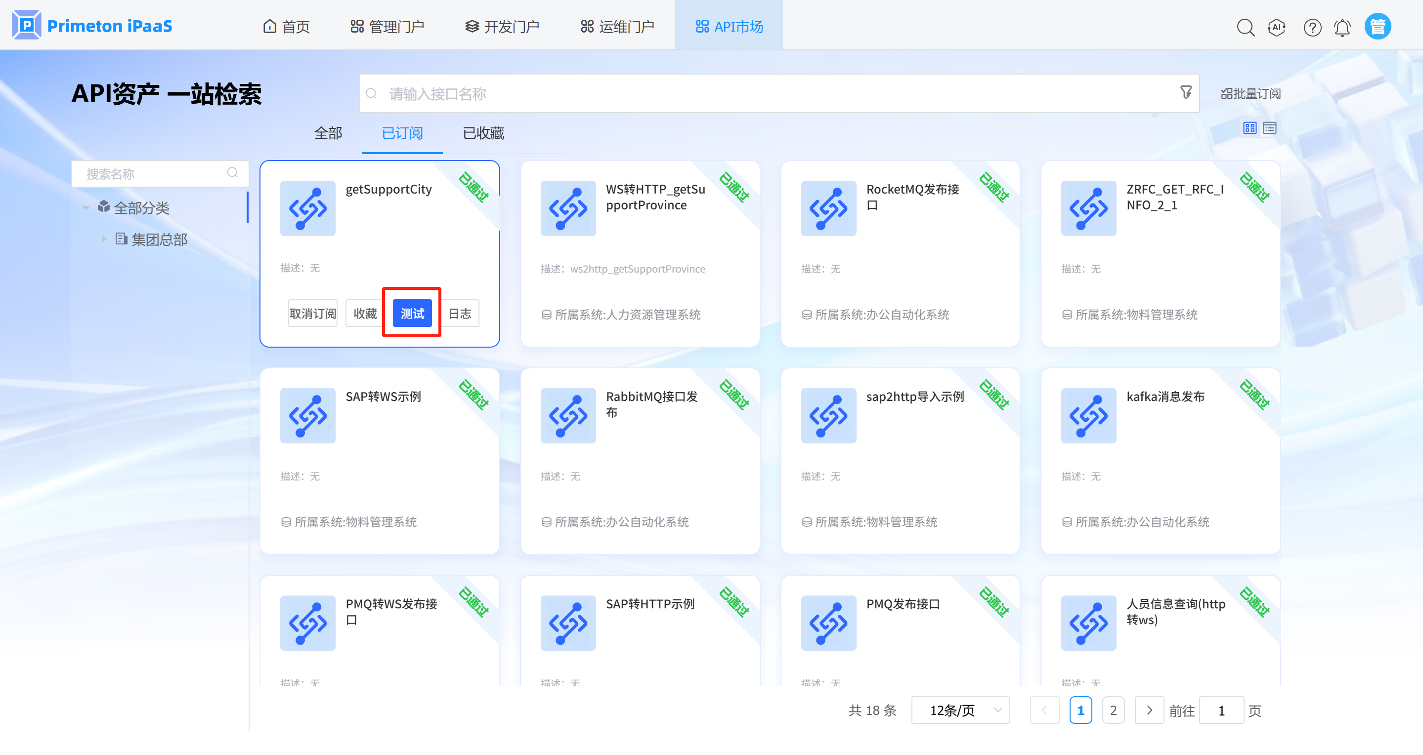 在”已订阅”页面,找到刚才订阅的接口信息,点击”测试”按钮,进入到”测试”页面。