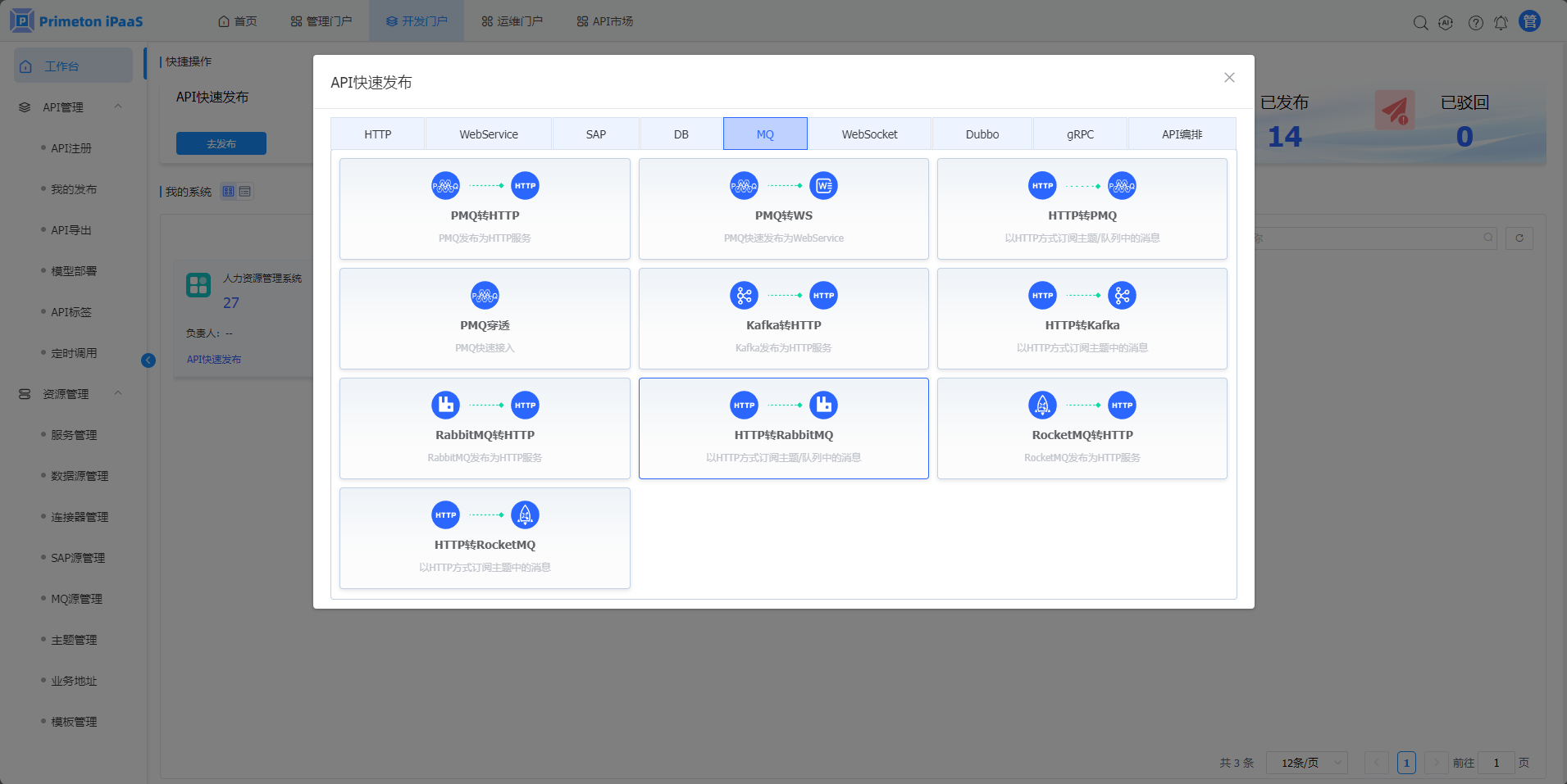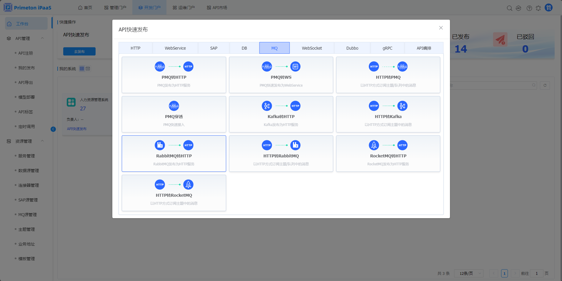 3.“API快速发布“弹窗,选择”MQ“页签,点击"RabbitMQ”转HTTP“按钮,进入”RabbitMQ转HTTP“接口发布页面。