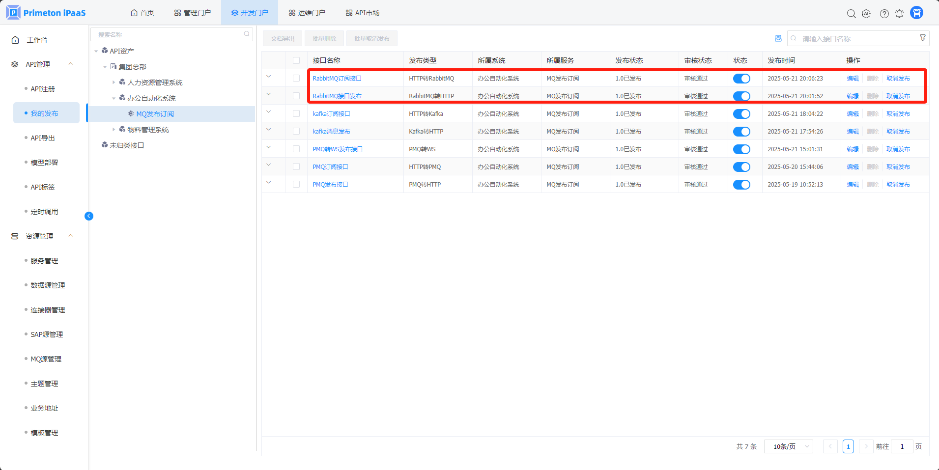 1.在"API管理">"我的发布"页面,可查看刚创建接口的发布记录。