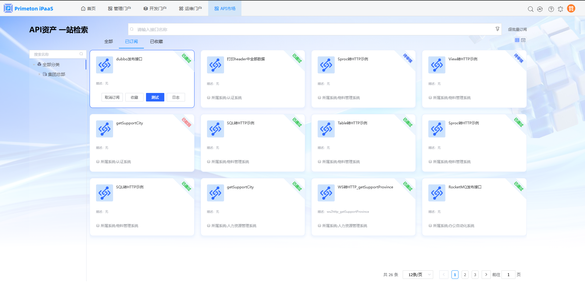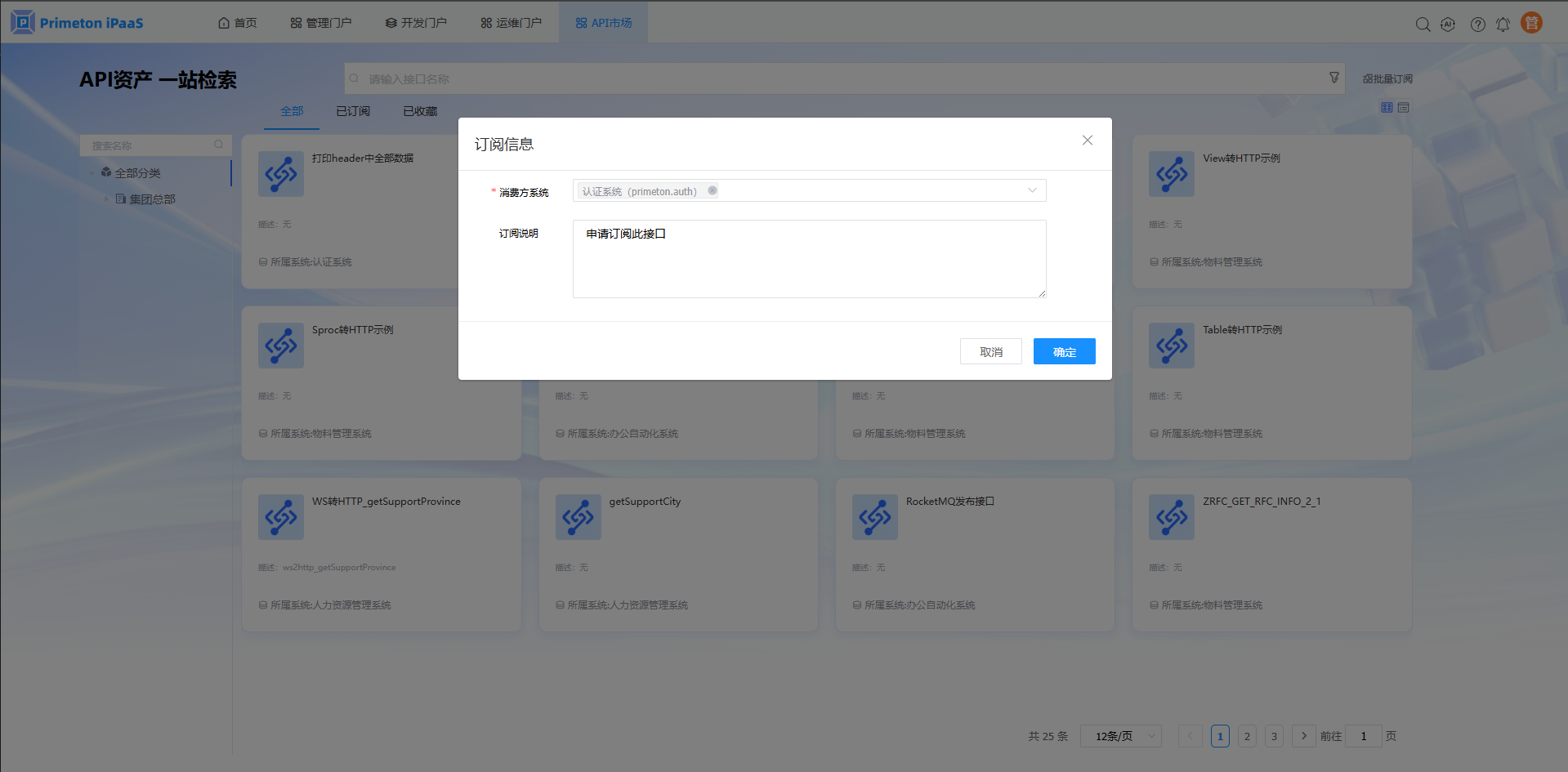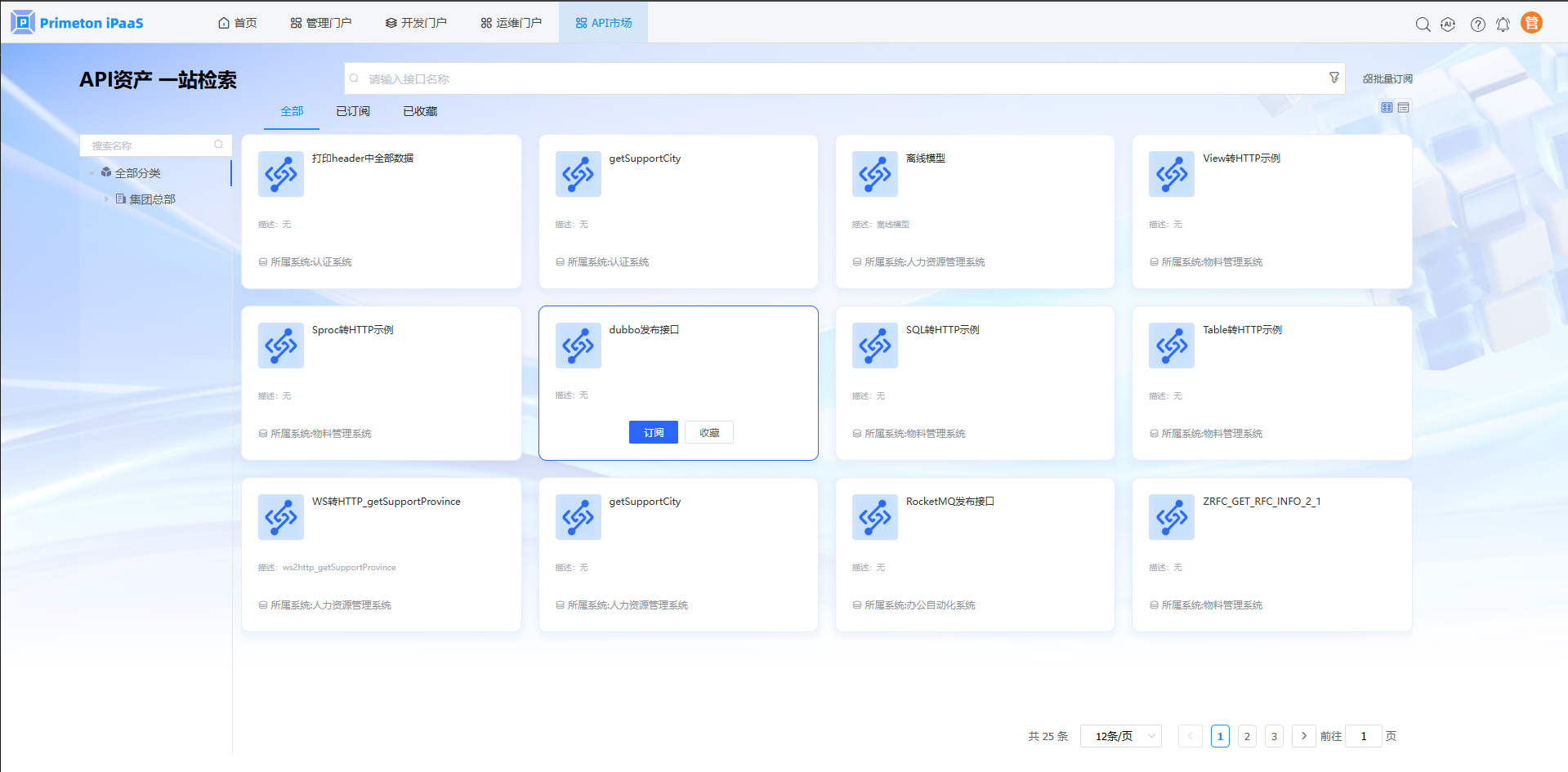 2.在“全部”页面,查看已发布的接口,点击”订阅”,申请订阅接口。