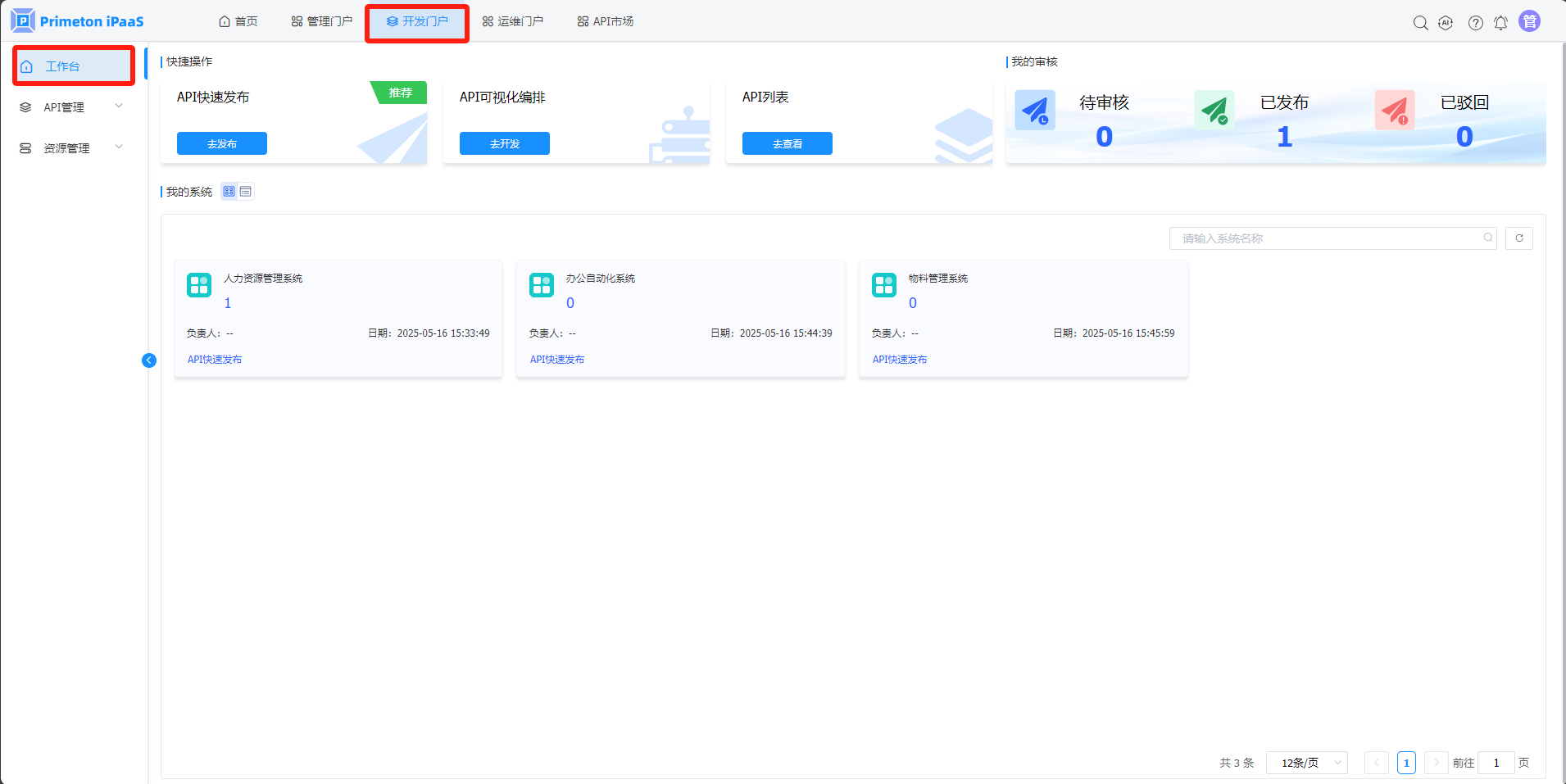 1.使用manager账号(默认密码:000000)登录系统,点击开发门户,进入“工作台”页面。