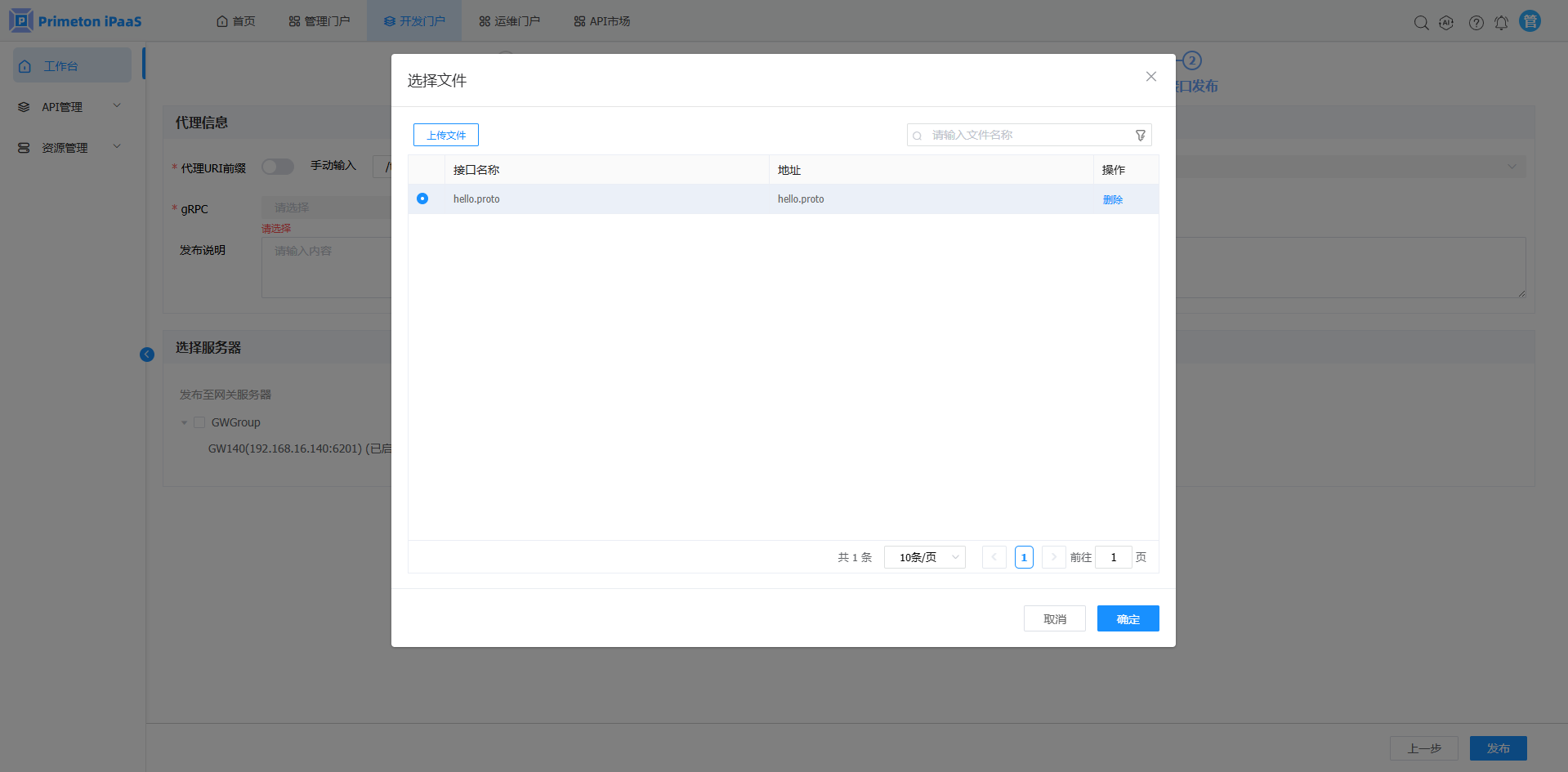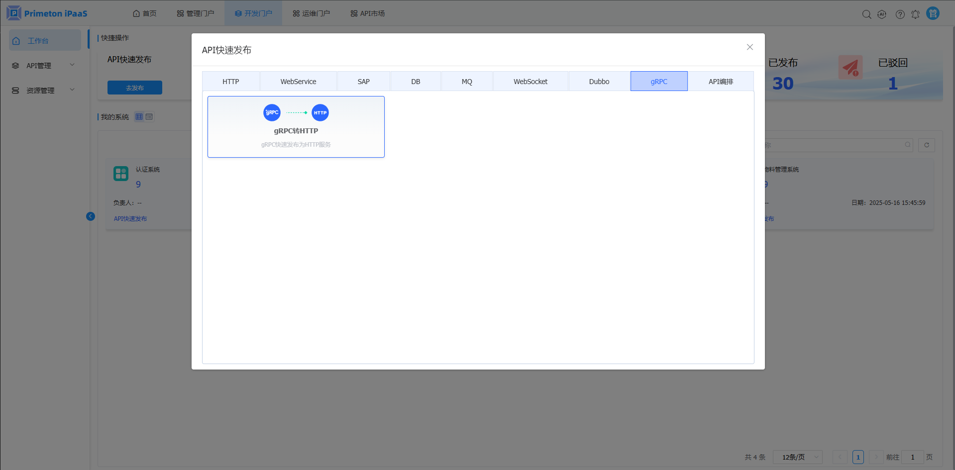 3.“API快速发布“弹窗,选择”gRPC“页签,点击”gRPC转HTTP“按钮,进入”gPRC转HTTP“接口发布页面。