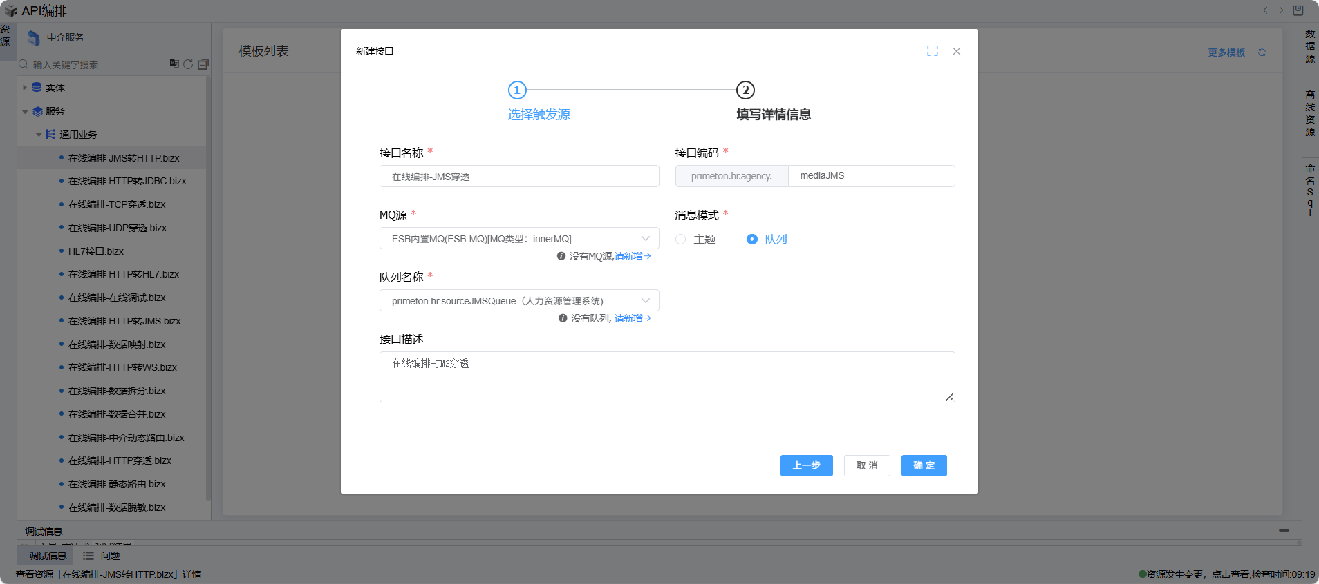 参数 说明 接口名称 业务接口名称 接口编码 业务接口编码 MQ源 选择触发的MQ源,此处选择 ESB内置MQ 消息模式 MQ源消息模式,此处选择 队列 队列名称 使用的队列名称,此场景选择上一步骤创建的 sourceJMSQueue 队列 接口描述 业务接口描述