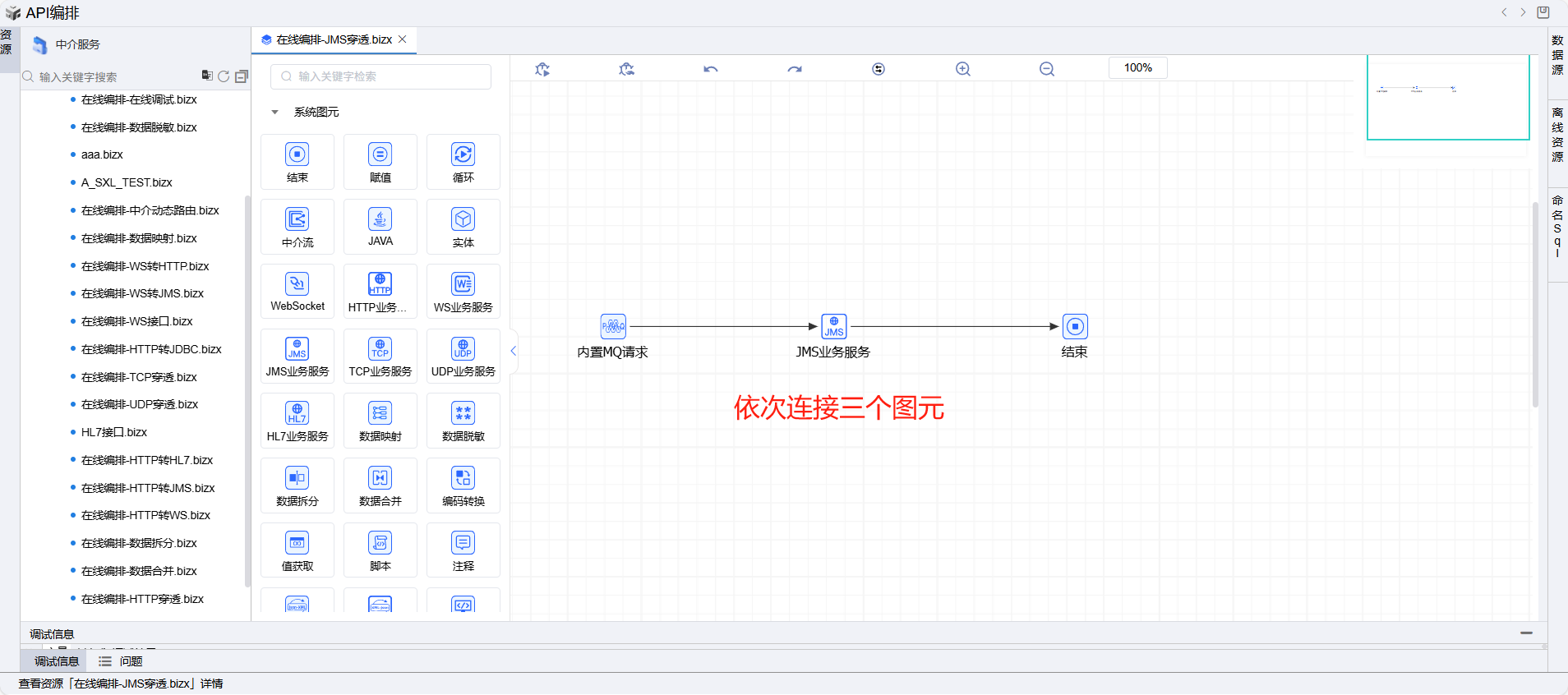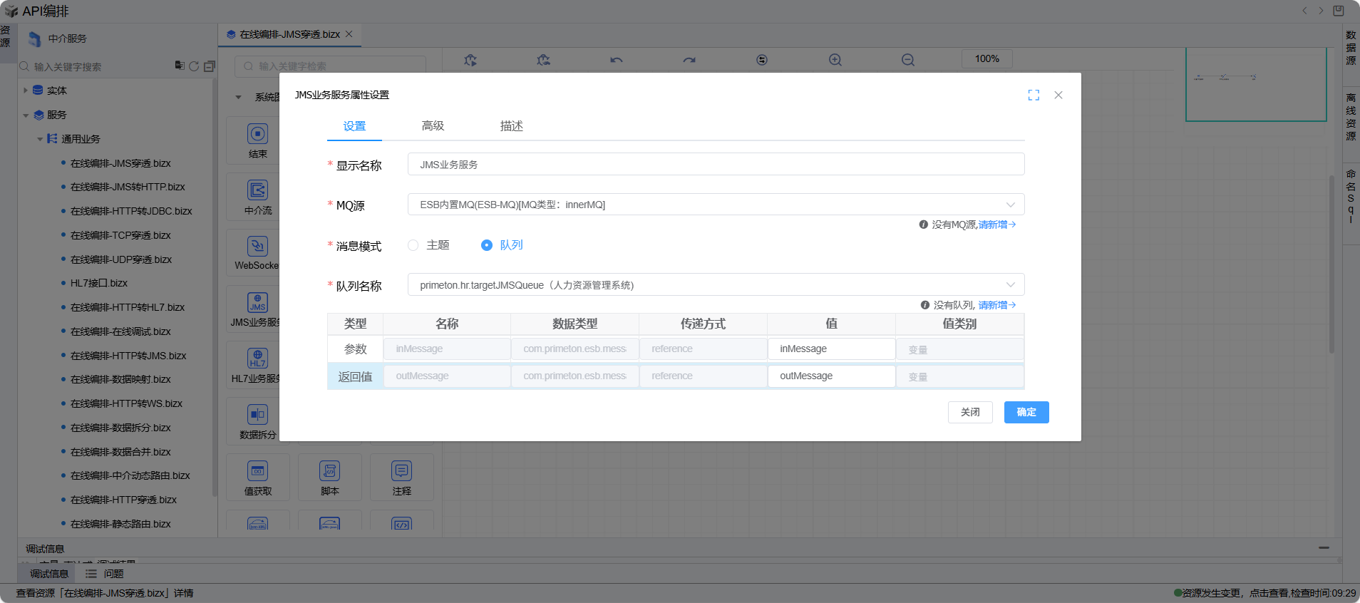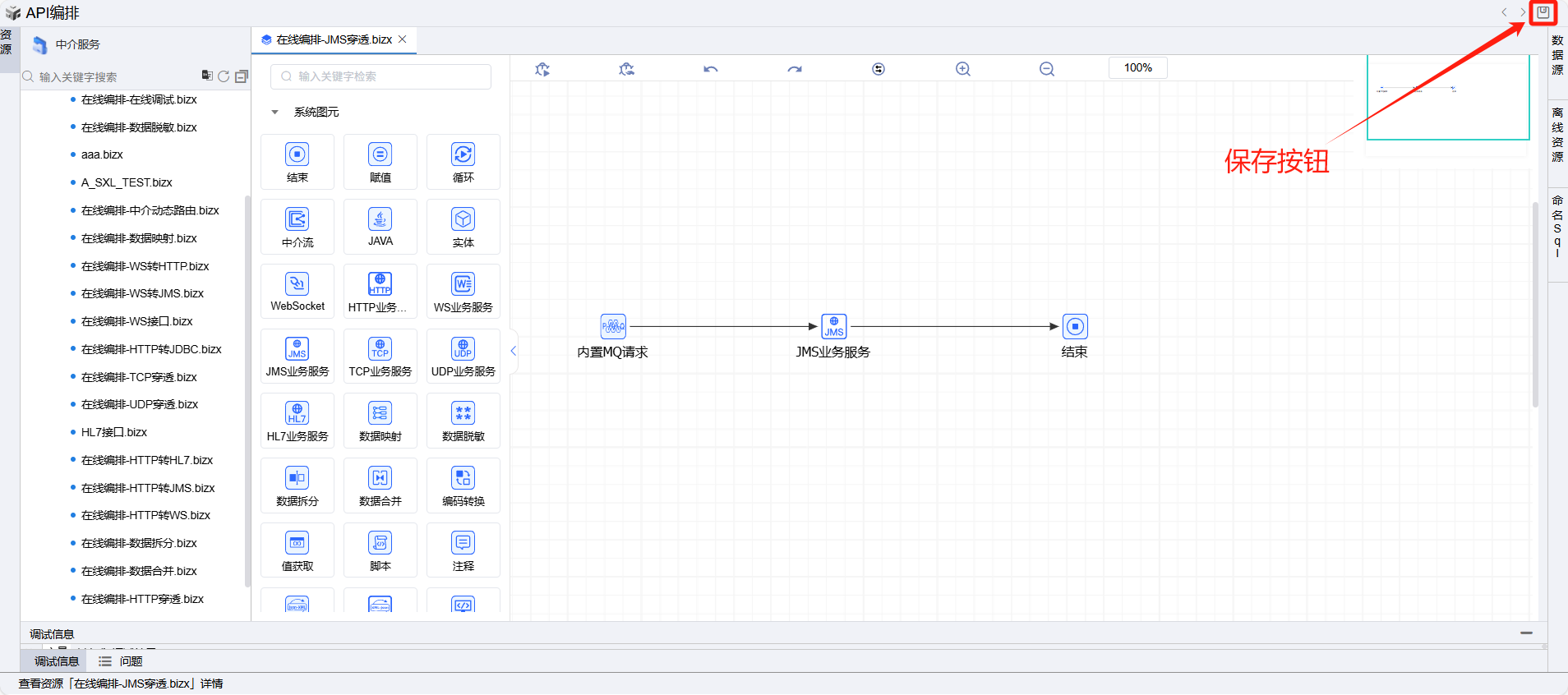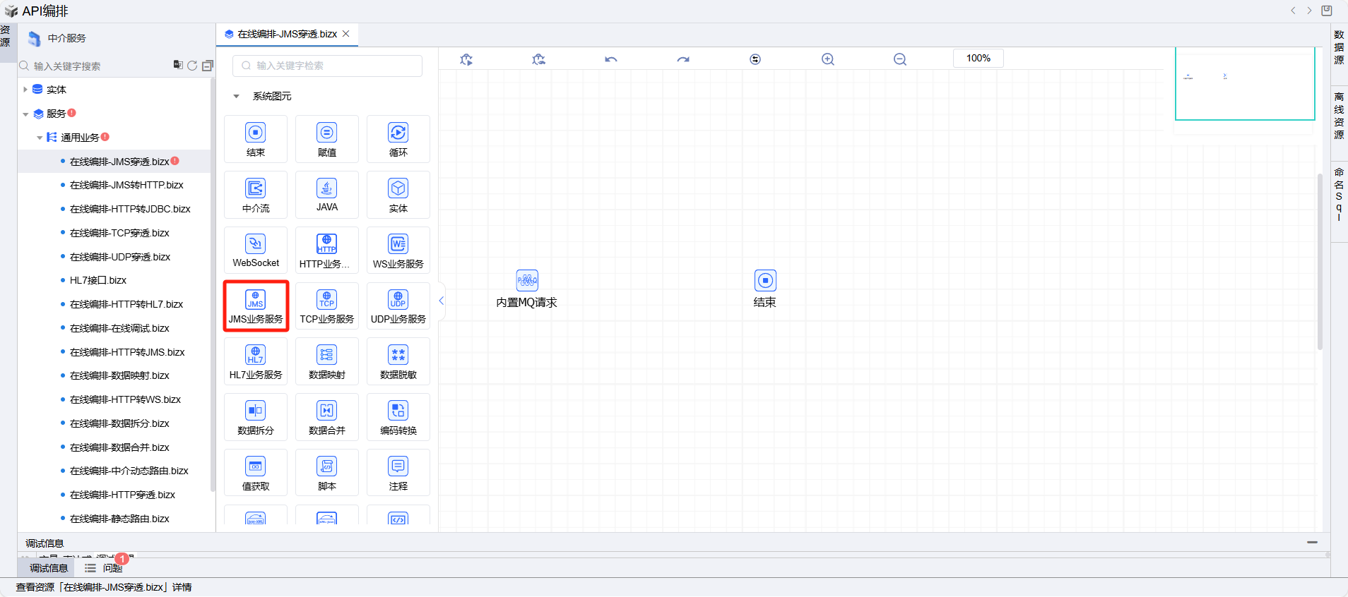 保存成功后系统自动打开中介编排页面。从左侧拖一个 JMS业务服务 图元到编辑区域。