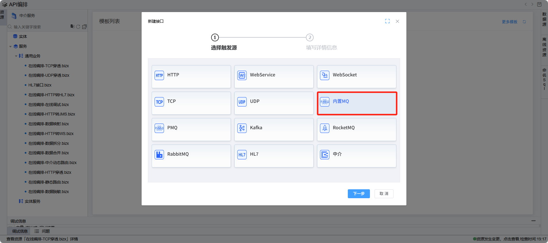 3. 在“新建API接口”页面,选择“内置MQ”选项,并点击“下一步”按钮,进入接口信息填写页面。
