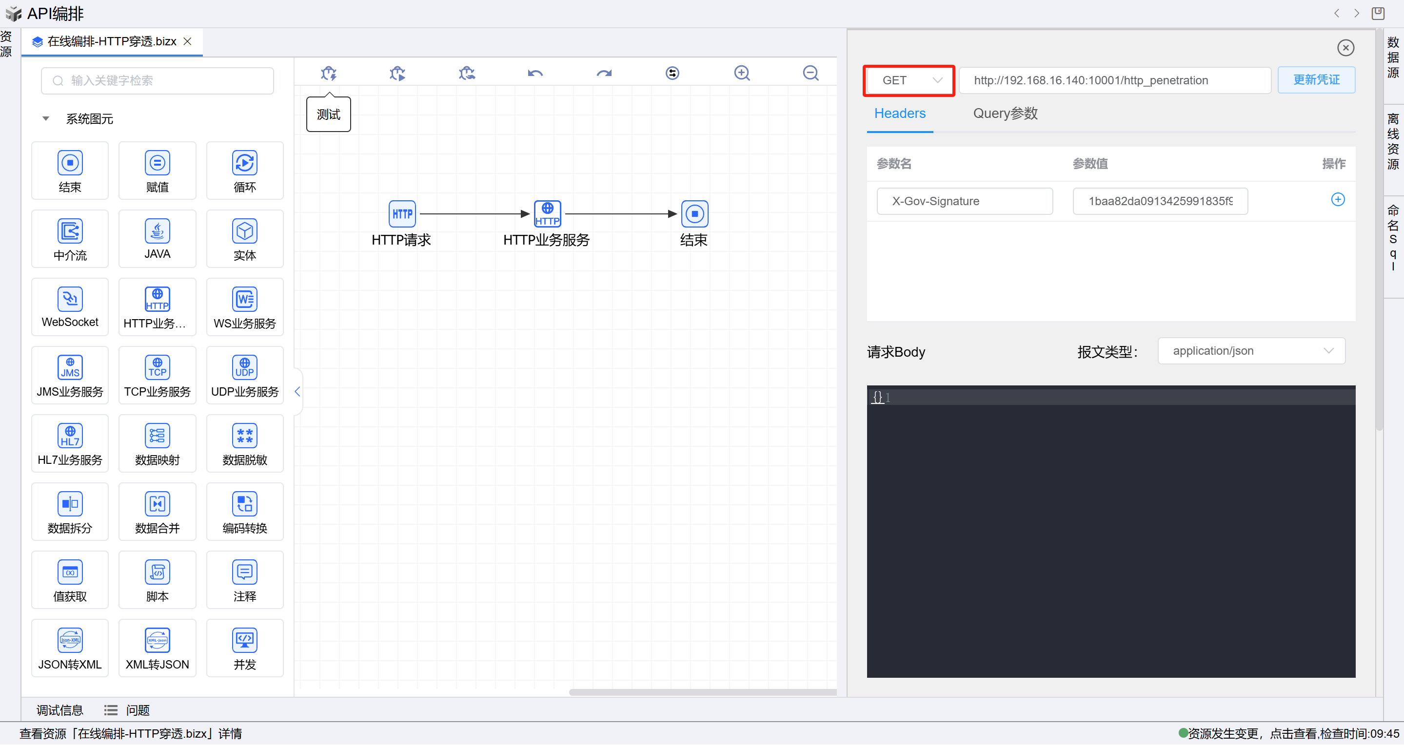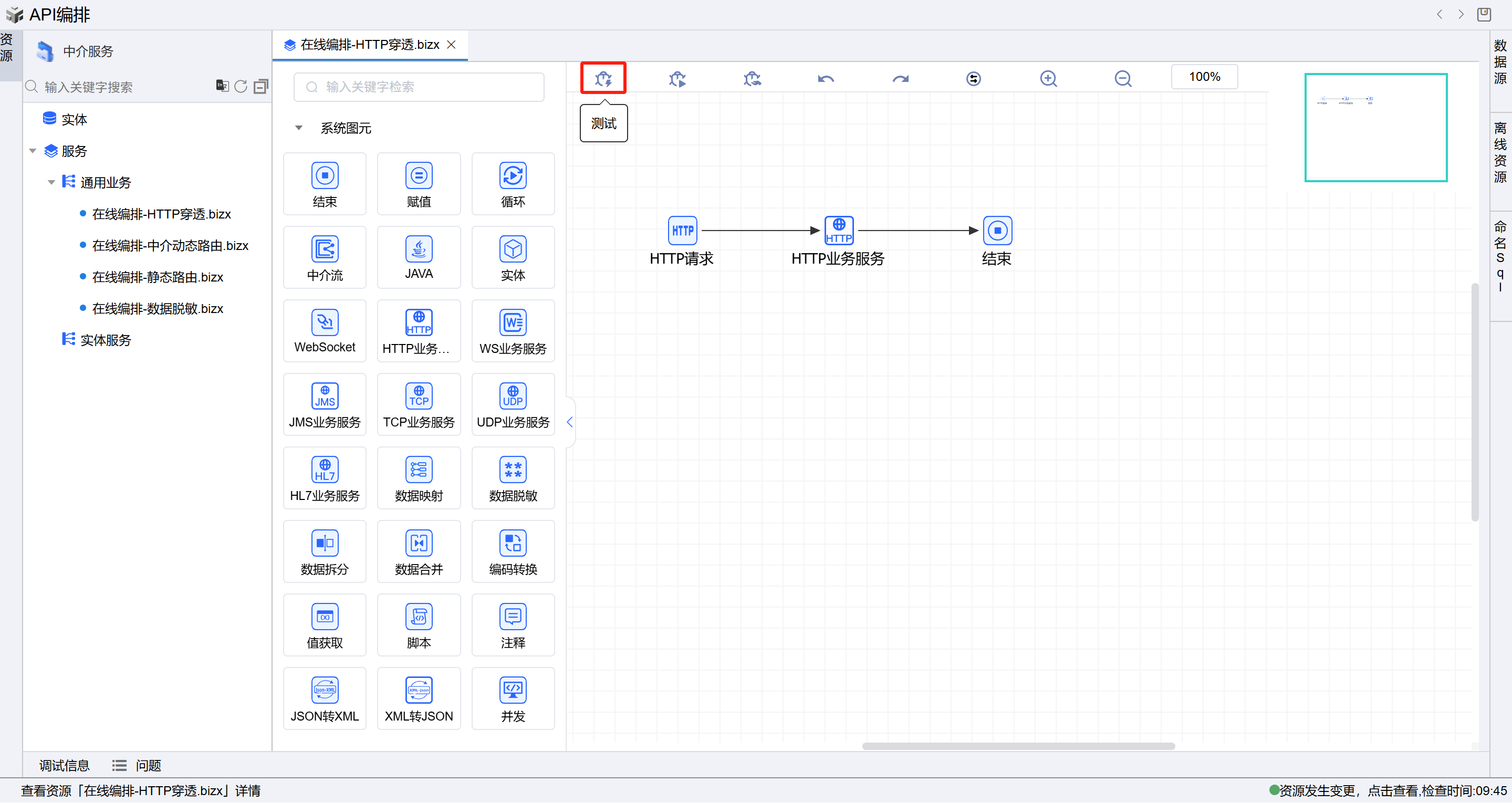 在线编排页面保存成功后,点击界面上方的测试按钮,如下图: