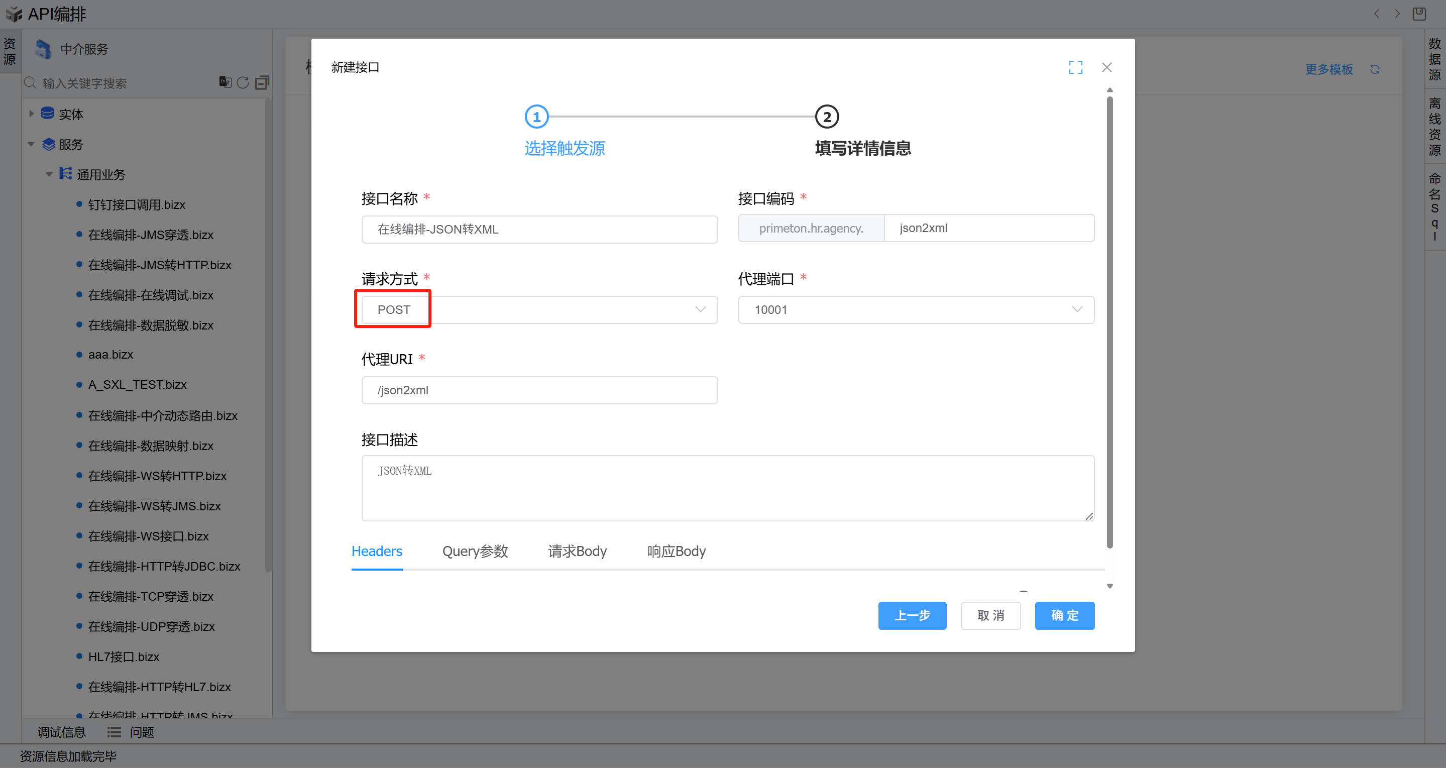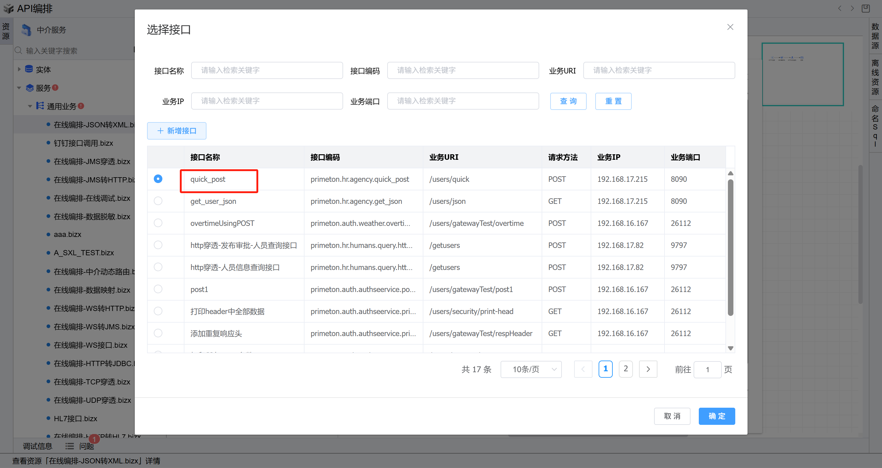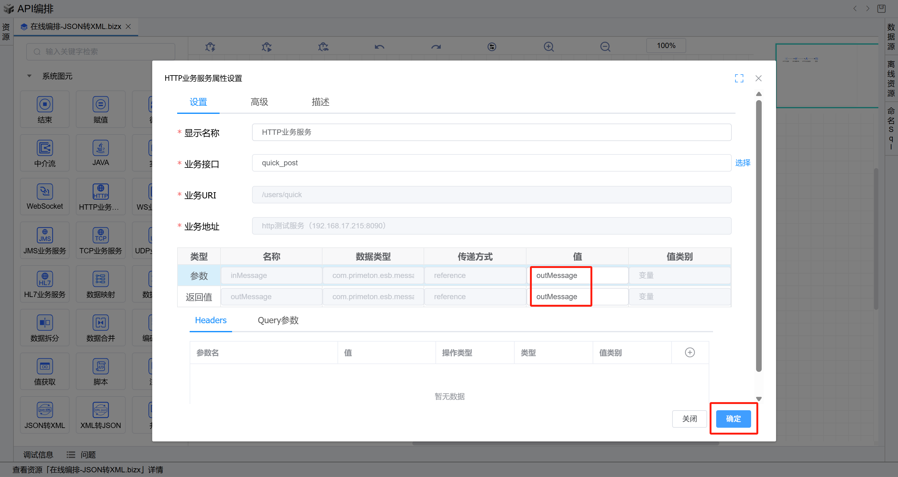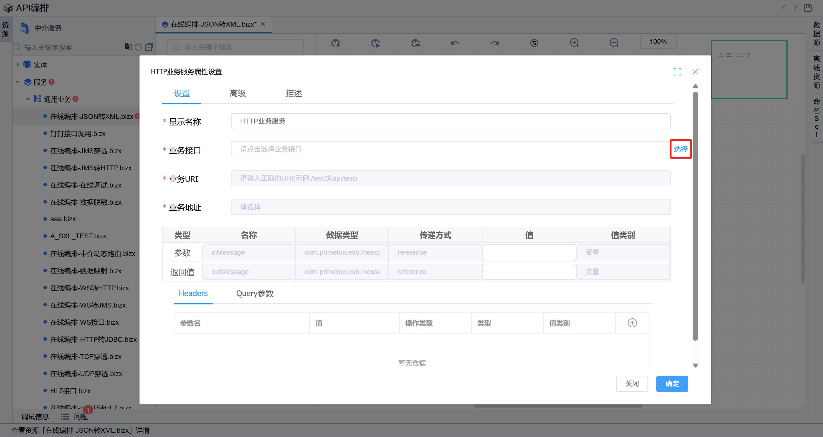 ,点击确定。如下图:双击打开第二个HTTP业务服务图元,在业务接口右侧,点击选择按钮,在弹出的选择接口页面选择前置条件中新增的接口,然后点击确定。然后回到HTTP业务服务图元, 参数选择