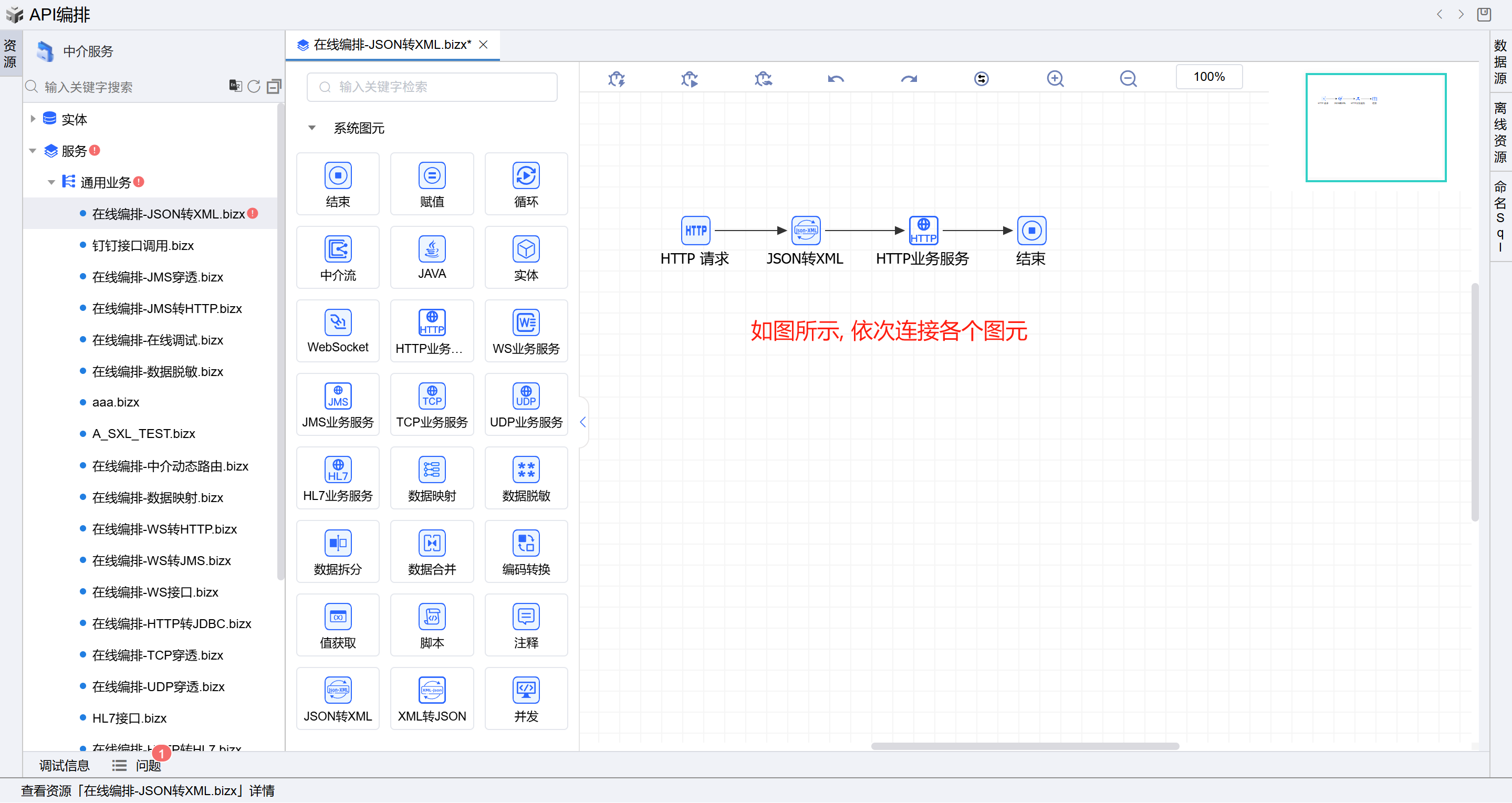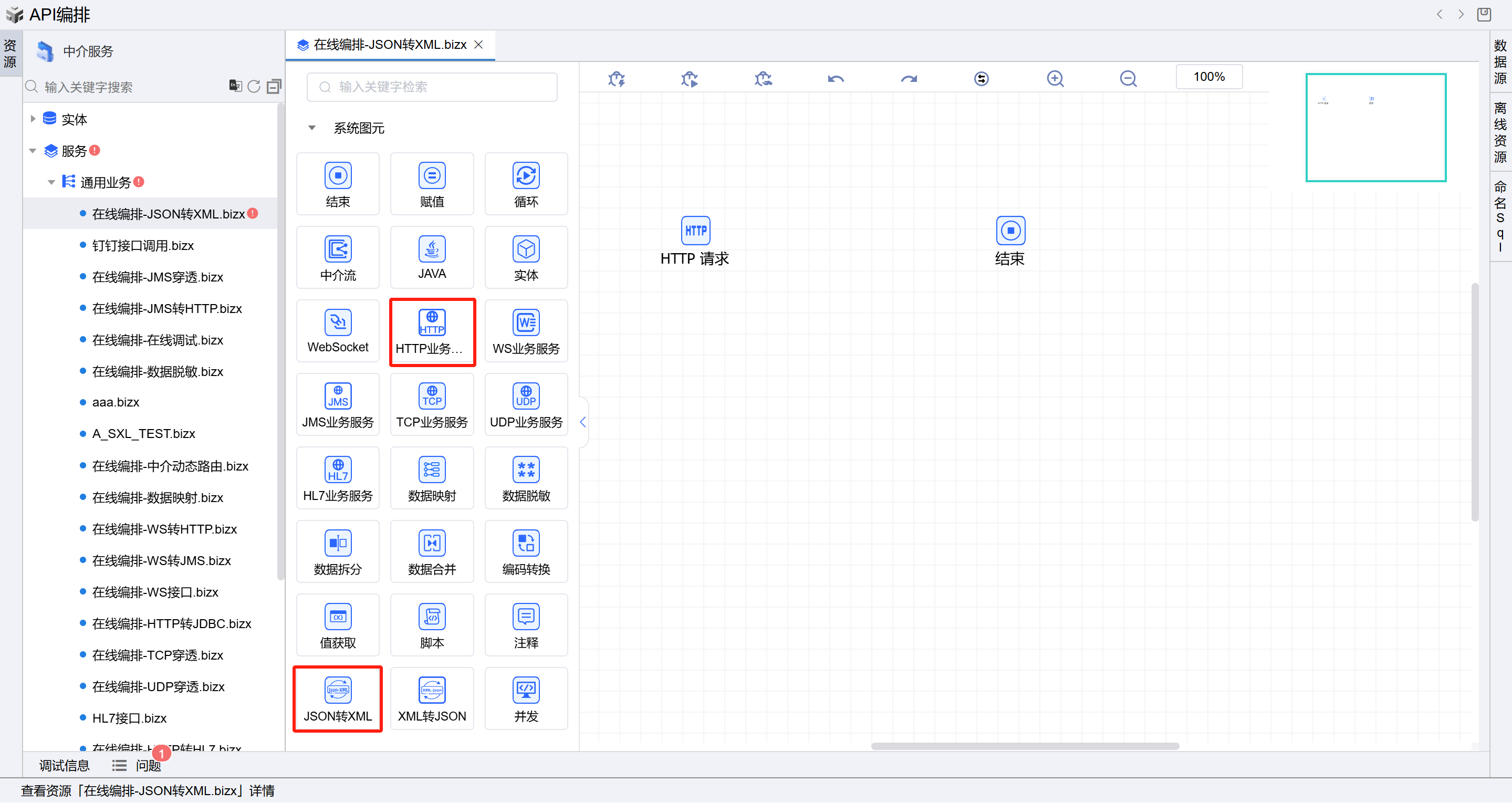 保存成功后系统自动打开中介编排页面,如下图所示。从左侧拖一个JSON转XML图元和一个HTTP业务服务图元到开始和结束图元中间并依次连接各个图元。如下图: