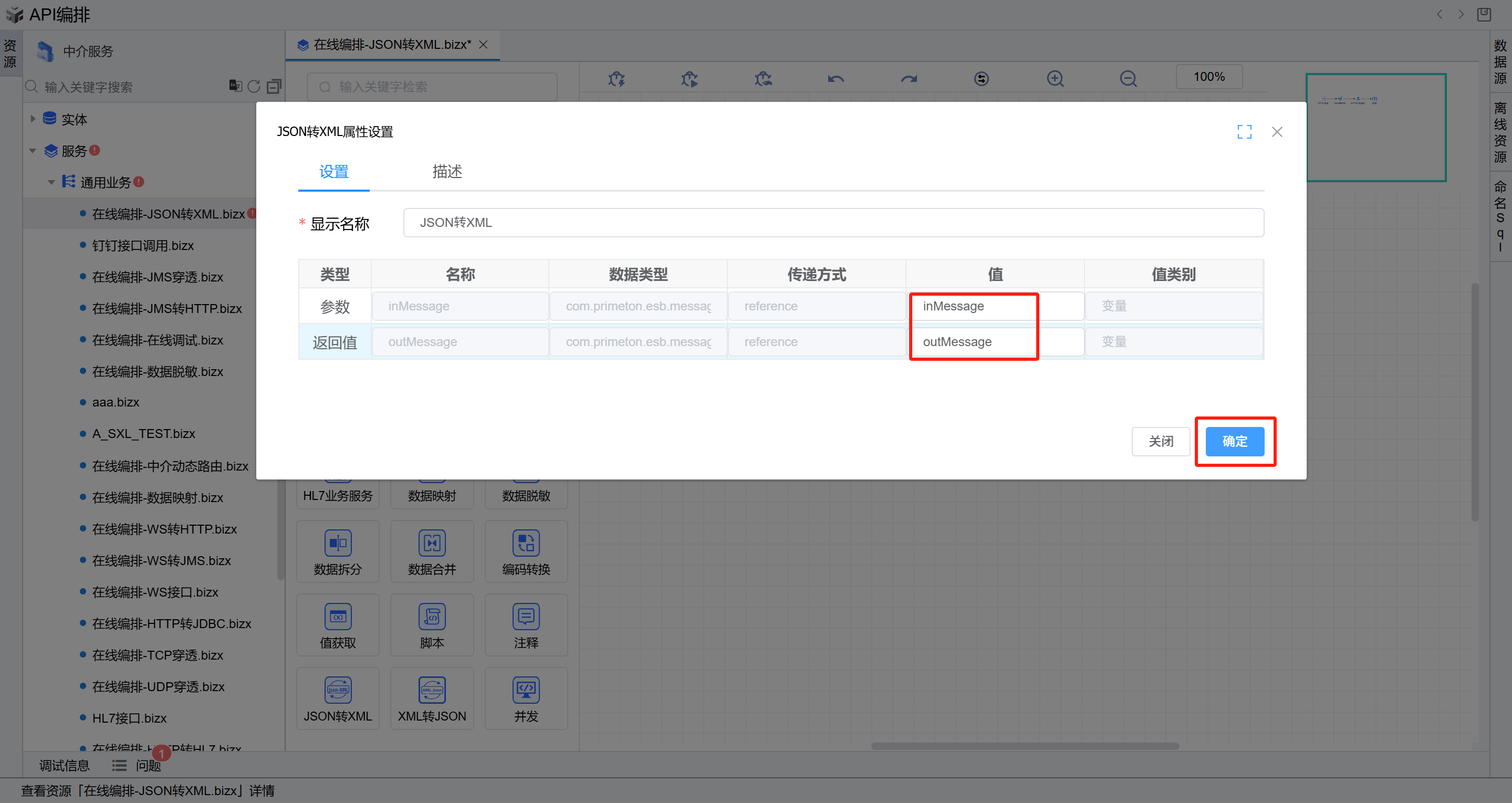 双击打开第一个JSON转XML图元,参数选择