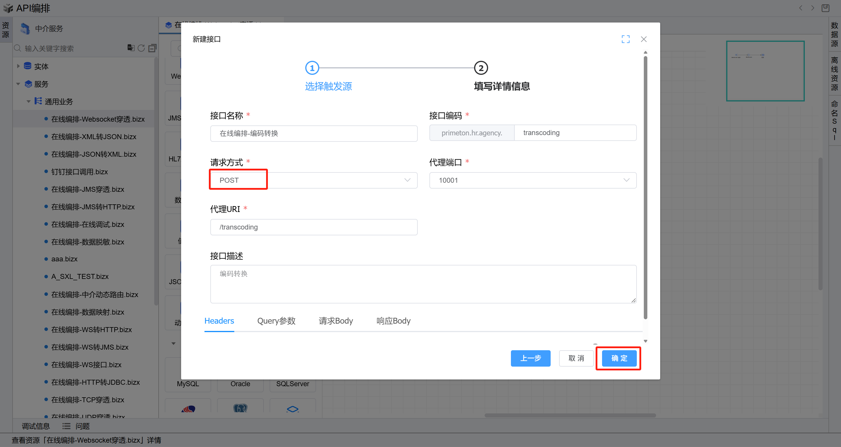 1. 在线编排页面中,在通用业务目录上点击右键,点击新建,点击新建HTTP接口,然后如下图所示填写数据,其中代理URI填写符合规则的接口地址,并点击确定保存。