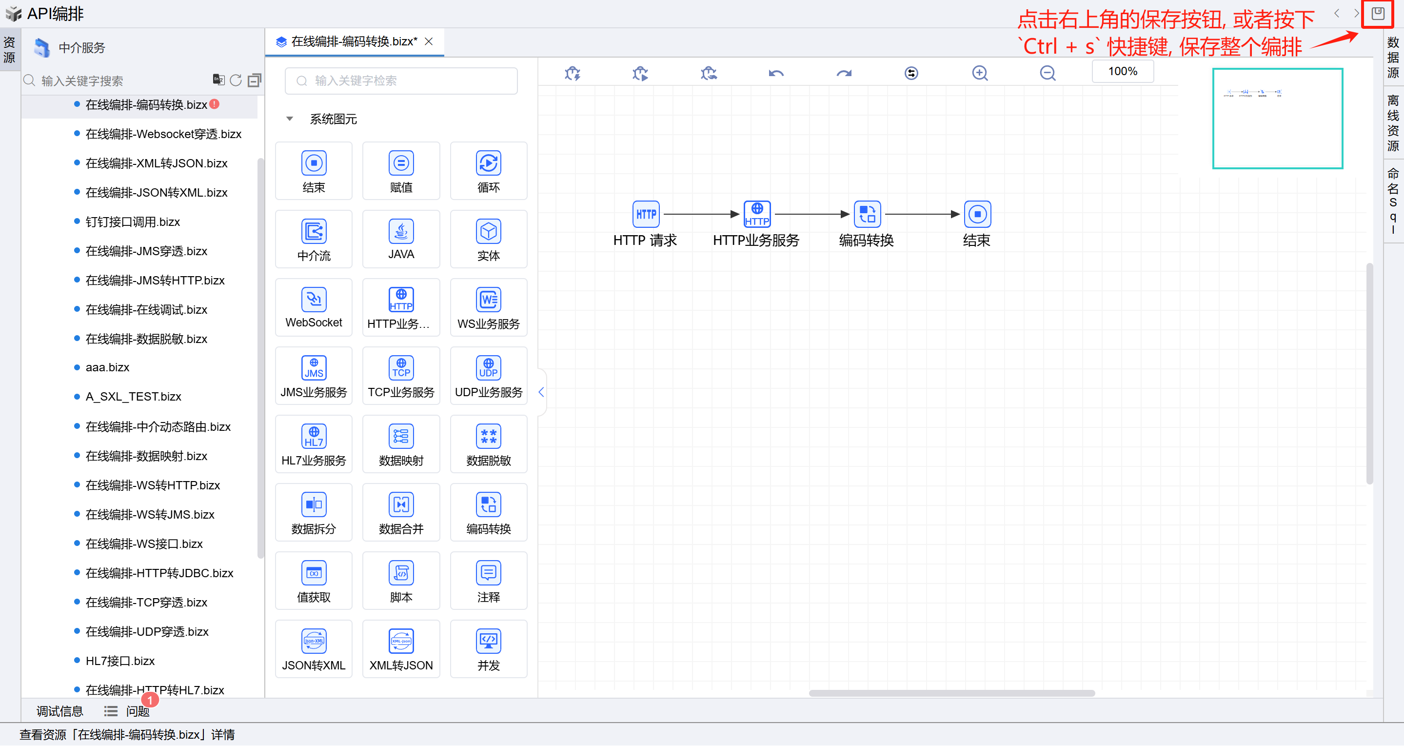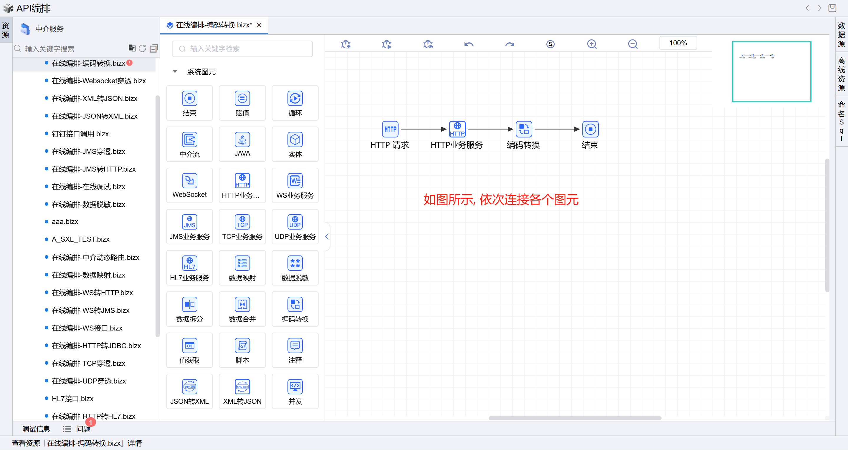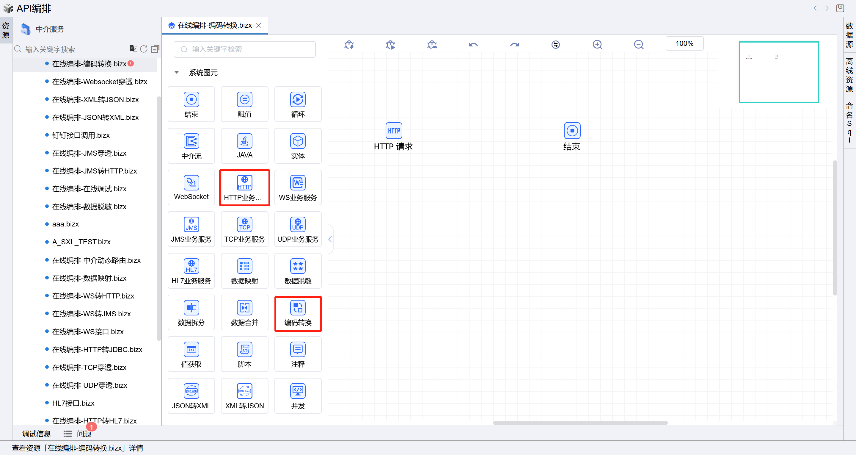 1. 保存成功后系统自动打开中介编排页面,如下图所示。从左侧拖一个HTTP业务服务图元和一个编码转换图元到开始和结束图元中间并依次连接各个图元。如下图: