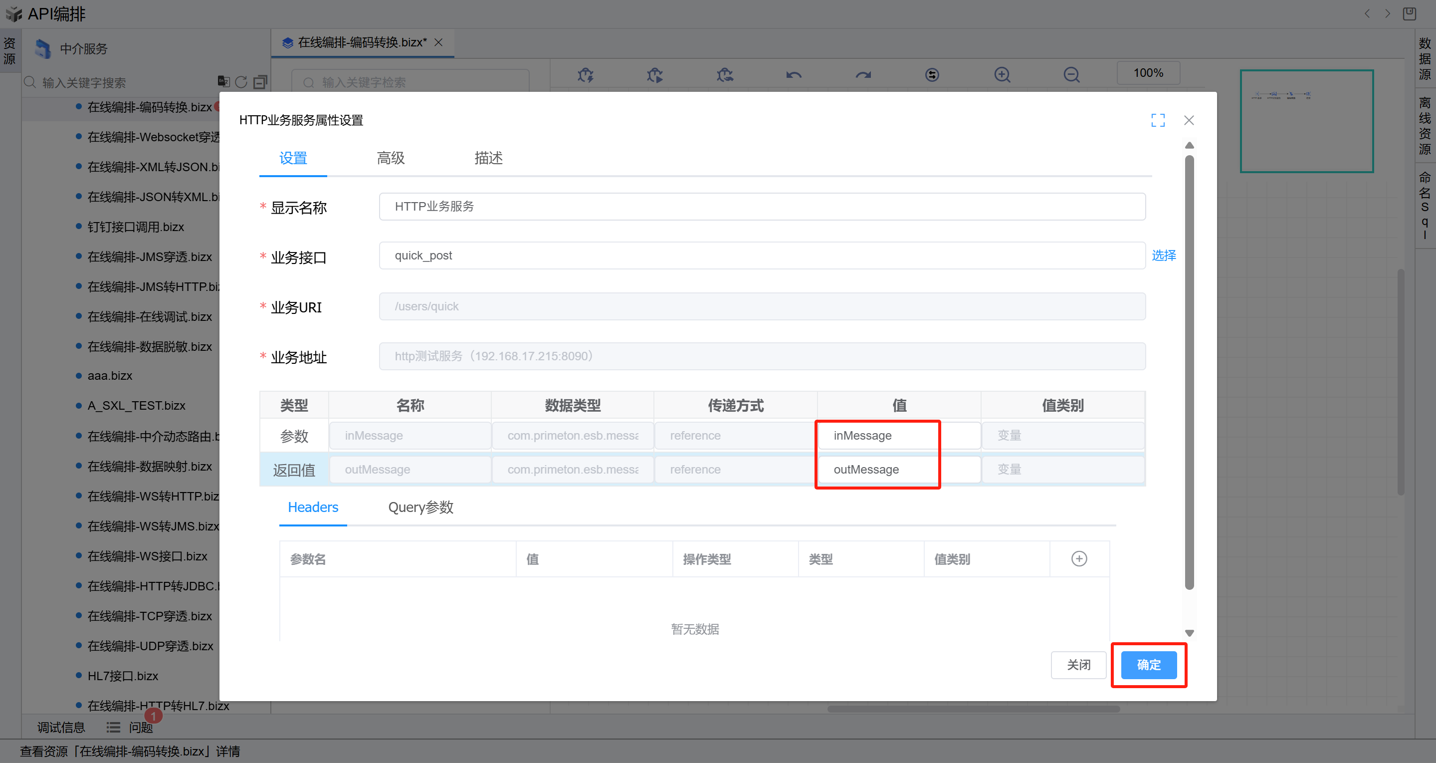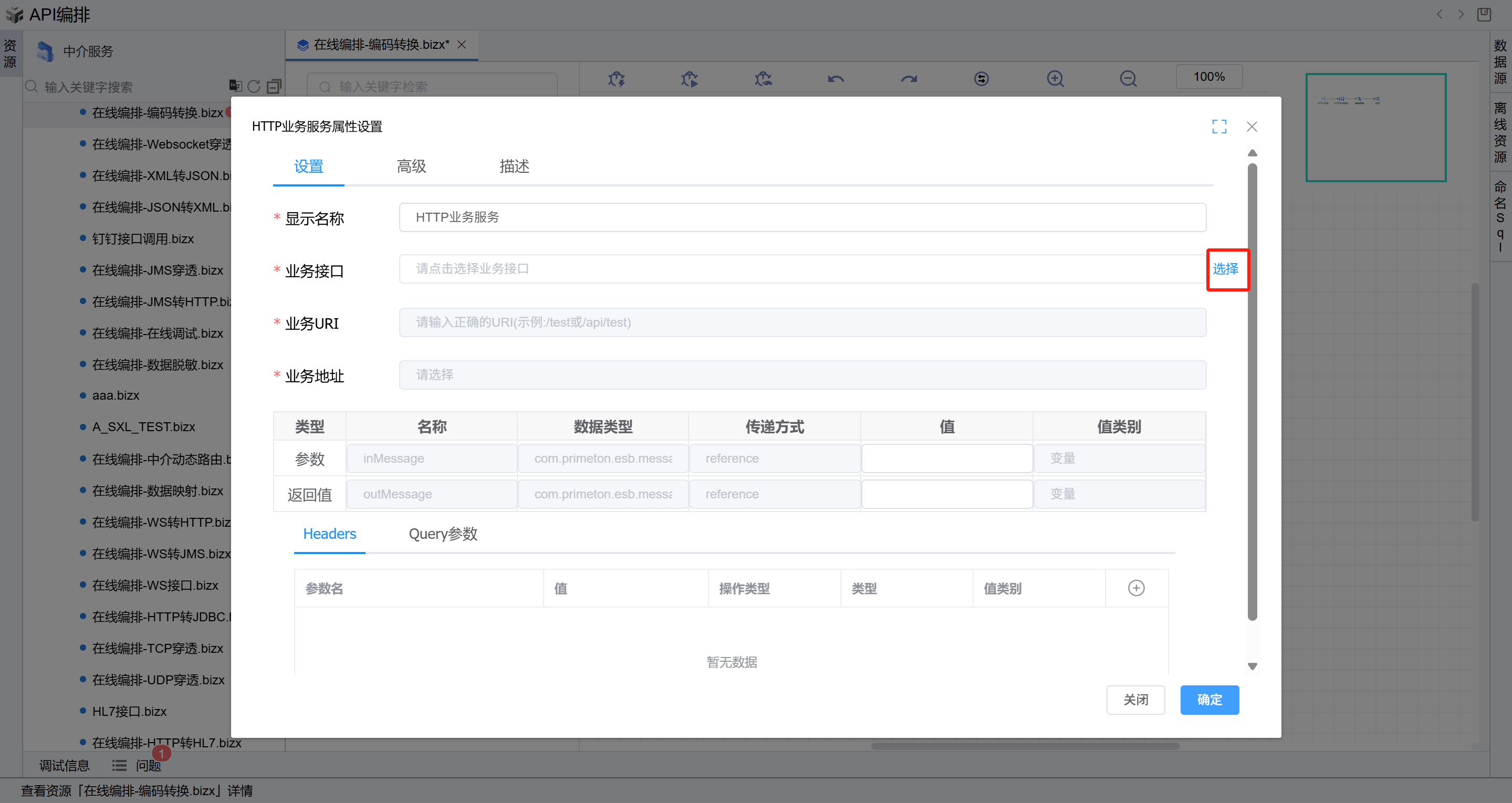 1. 双击打开HTTP业务服务图元后,业务地址右侧点击选择按钮,在选择接口页面选择“前置条件“中新增的接口,点击确定按钮。 回到HTTP业务服务属性设置页面,在下方表格中的参数和返回值分别选择inMessage和outMessage,然后点击确定按钮关闭对话框。如下图: