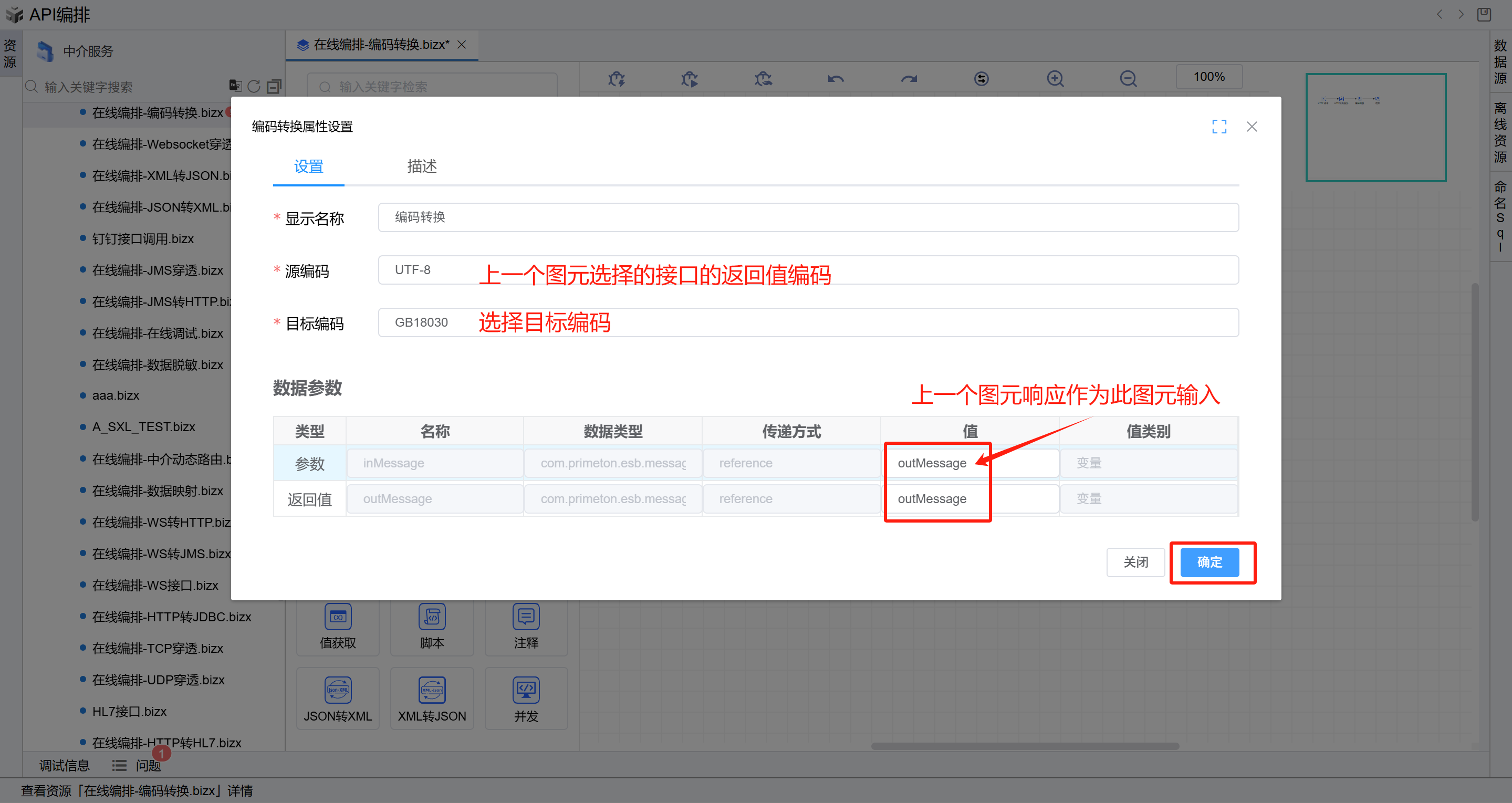 1. 双击打开编码转换图元后,在源编码下拉框选择上一个图元接口返回的真实编码,在目标编码下拉框选择目标编码, 在下方表格中的参数和返回值分别选择inMessage和outMessage(上一个图元转换后的返回值),然后点击确定按钮关闭对话框。如下图: