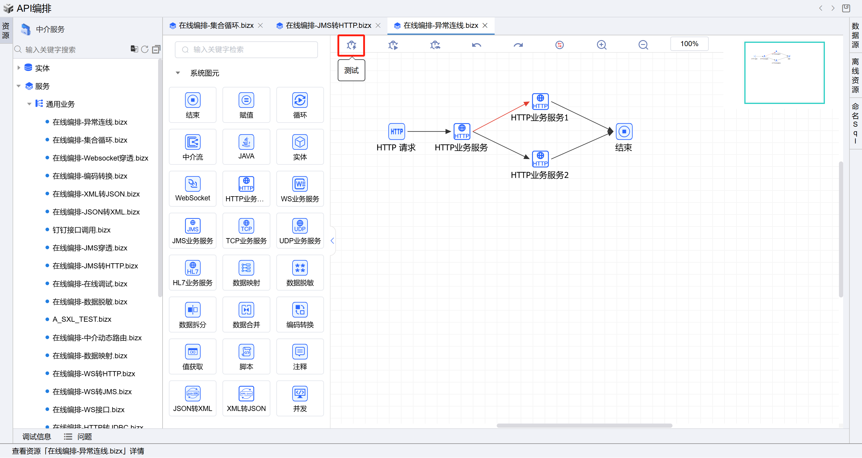 在线编排页面保存成功后,点击界面上方的测试按钮,如下图: