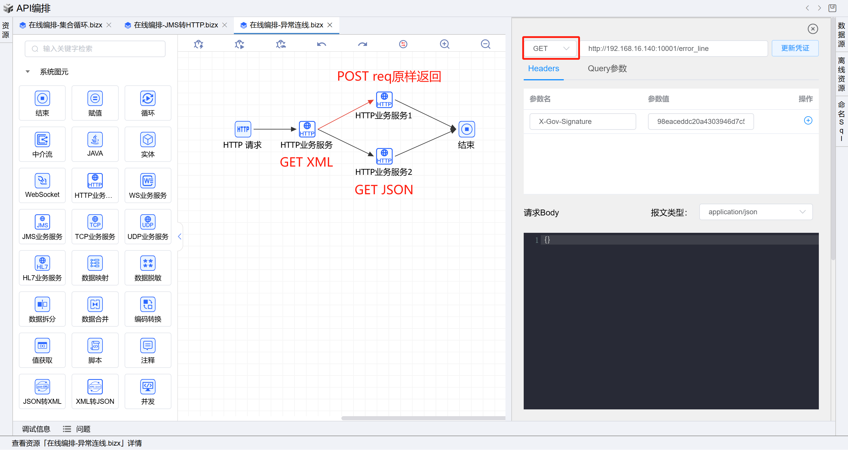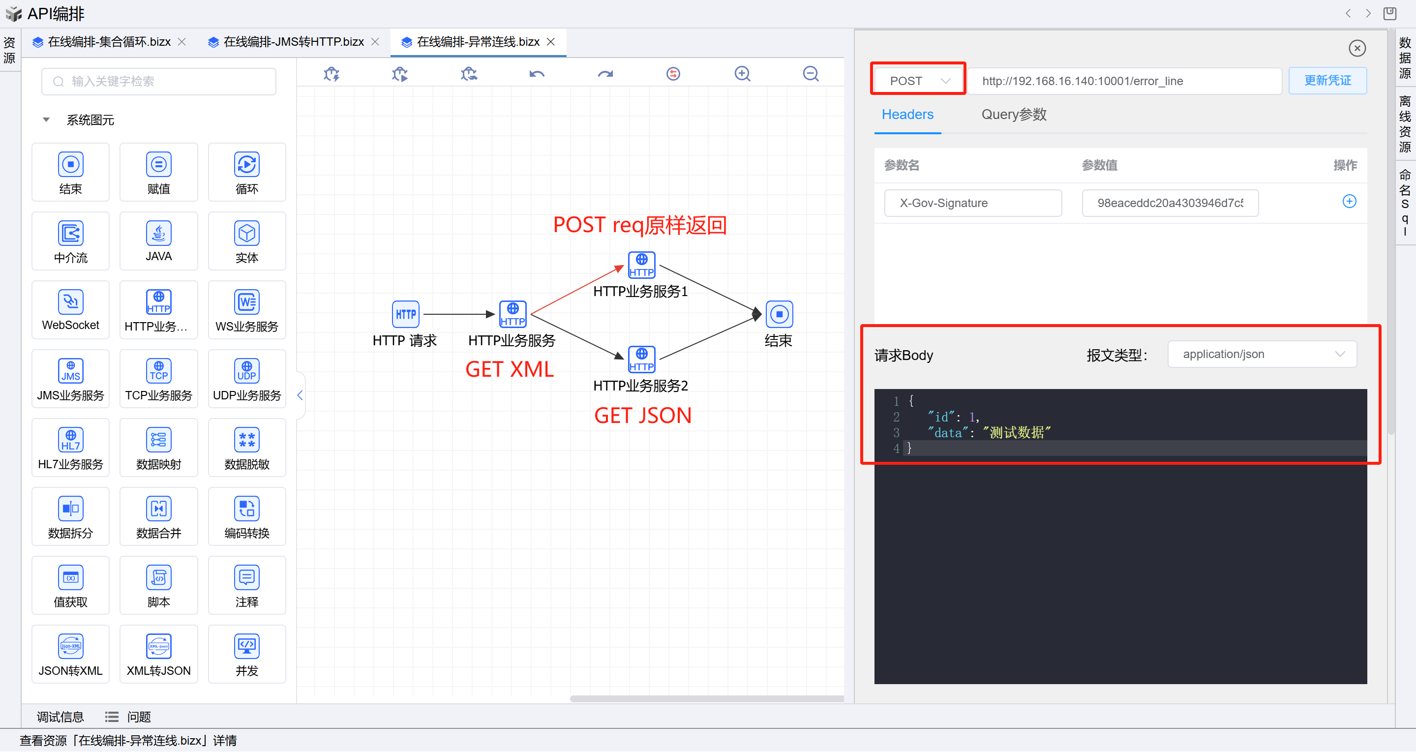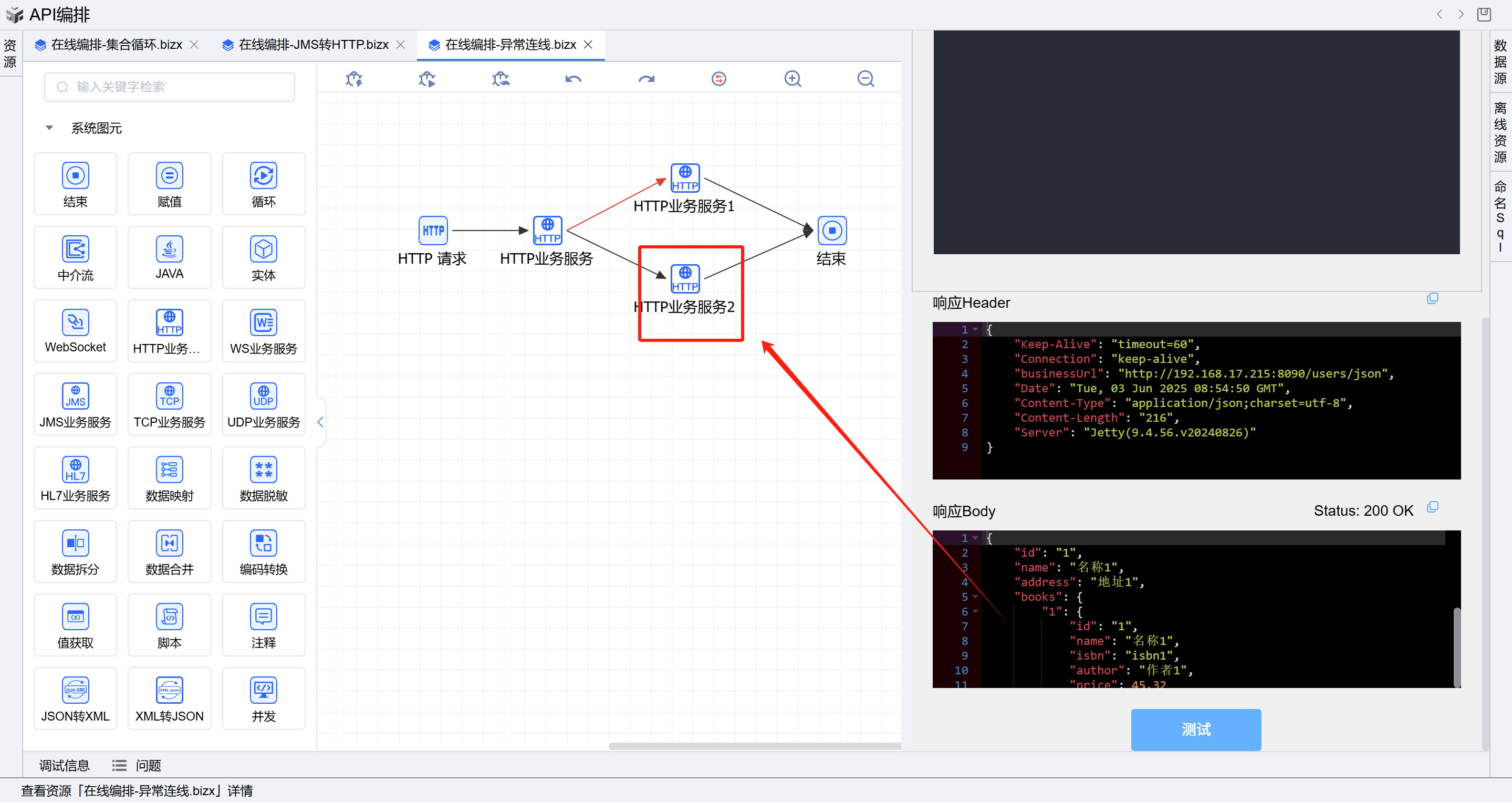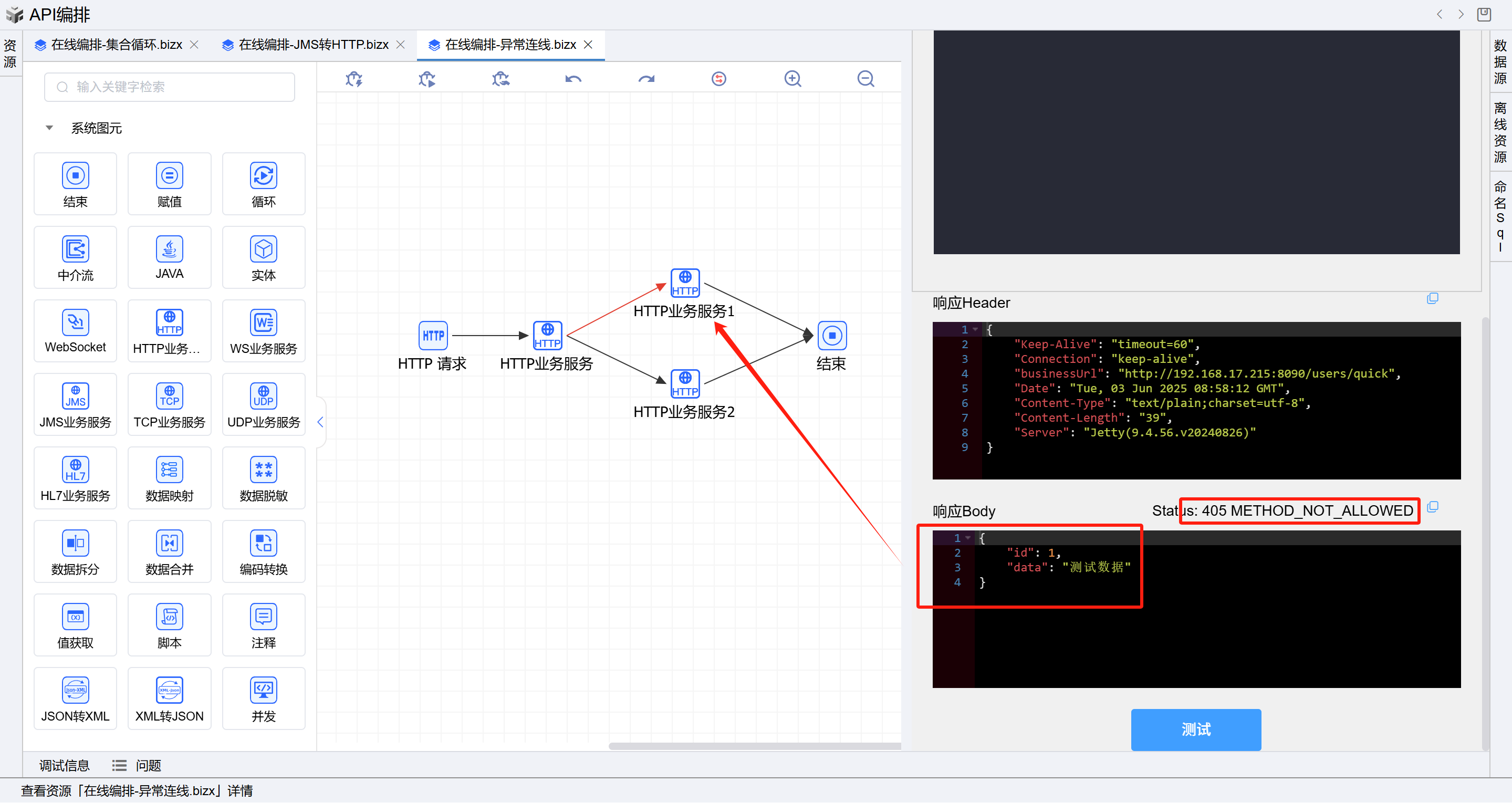 点击测试,返回了如上示例报文信息,符合异常(请求方法不匹配)连线编排预期。如下图: