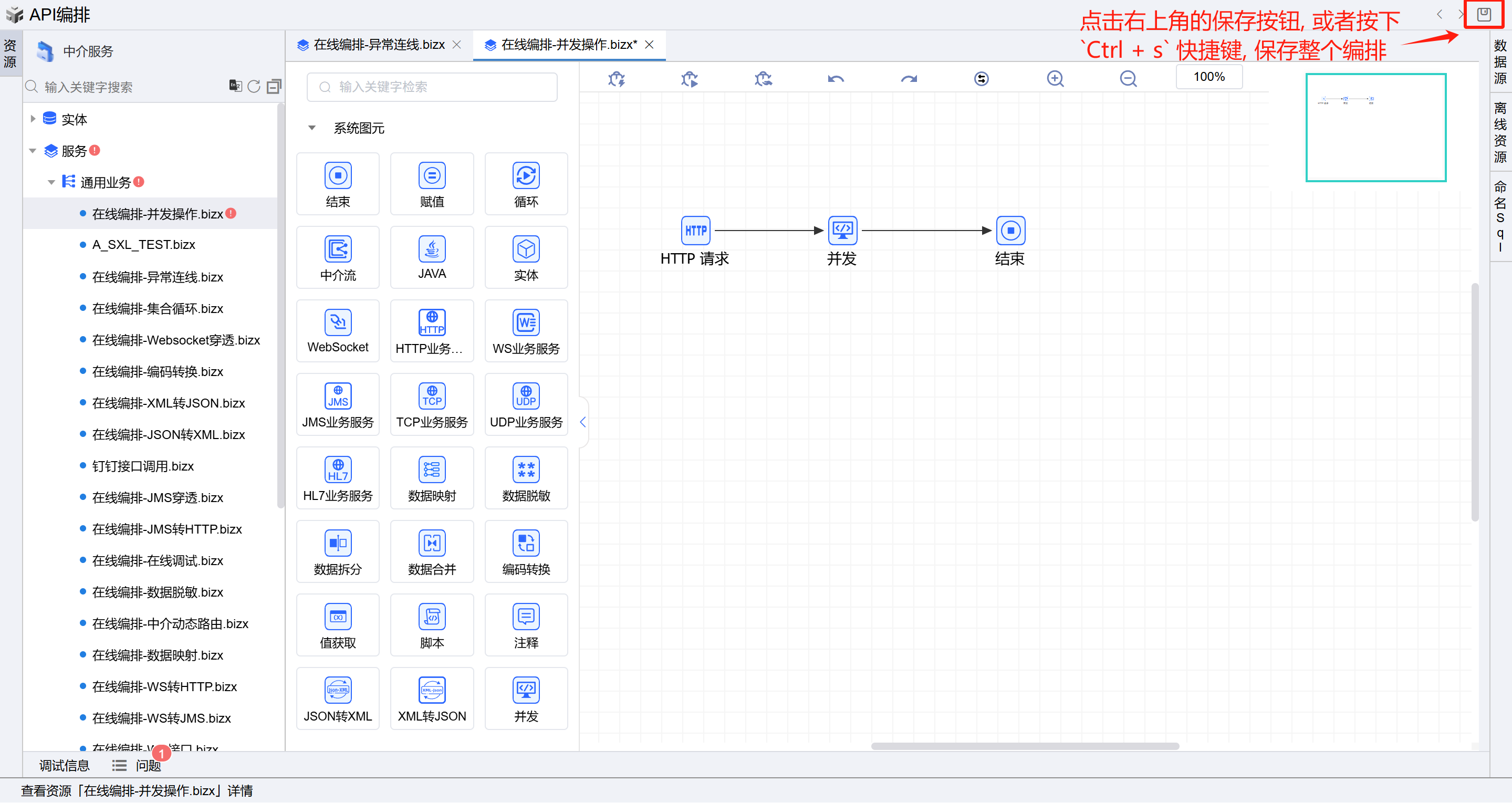 • 1.1. 或者点击中介服务,点击API编排按钮进入在线编排页面。如下图: